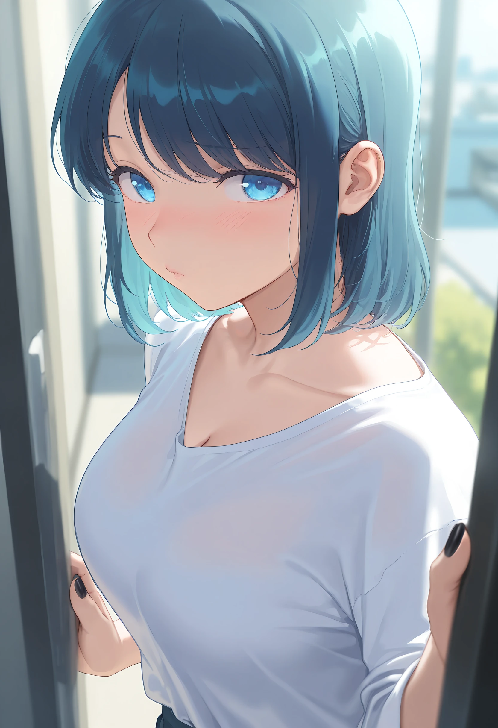 EBShio, 1girl, solo, medium breasts, medium hair, blue eyes, blue hair, swept bangs,