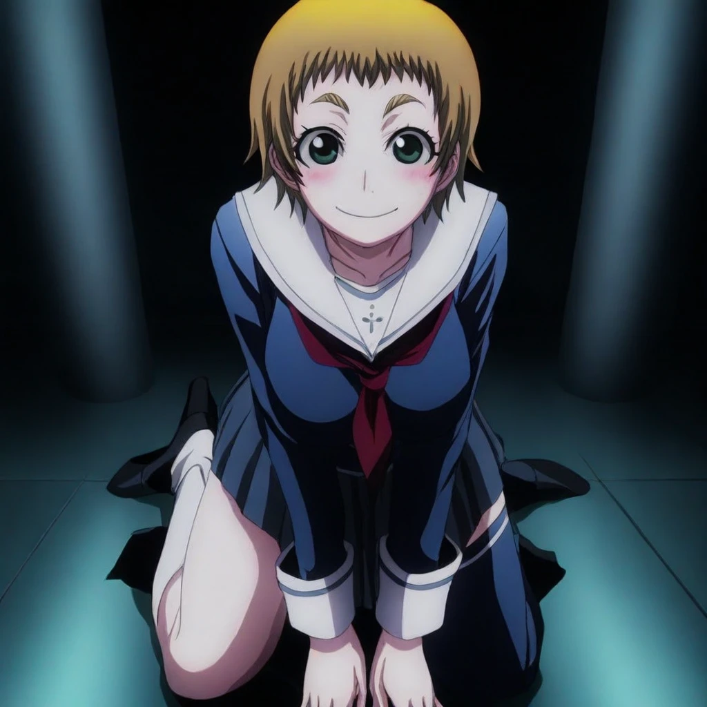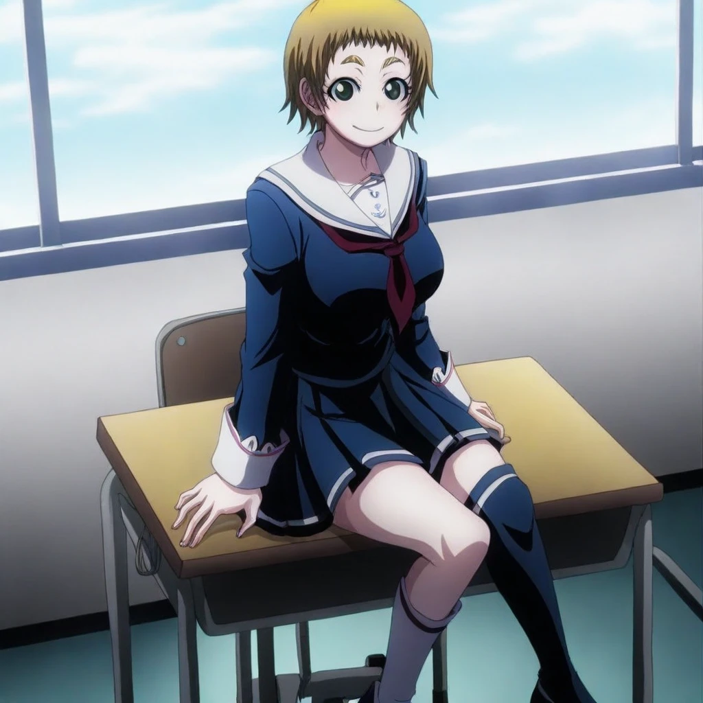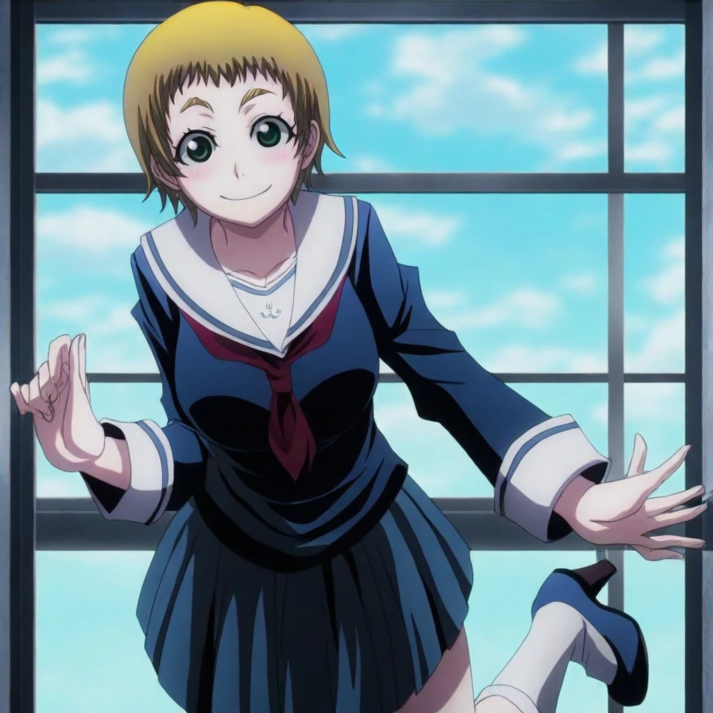 momoe okonogi \(dusk maiden\), blonde hair, short hair, green eyes, school uniform, neckerchief, skirt, asymmetrical legwear, socks, heels, large breasts, 1girl, solo