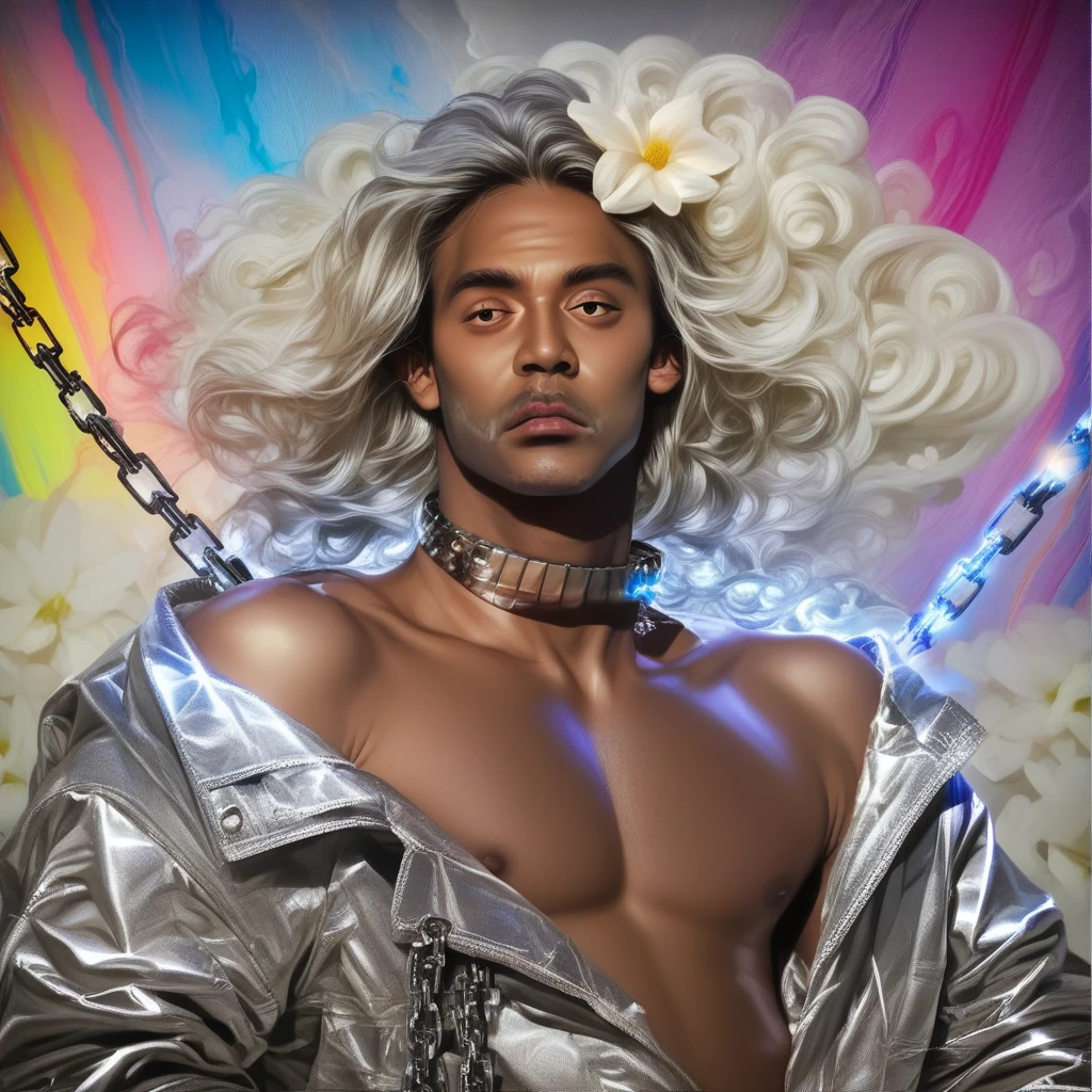 painting by Hajime Sorayama, cloth, chrome cloth, colorful, chrome trash, chrome skin, chrome, plastic, chrome jacket, chrome bikini, lips parted, abstract, cyborg, science fiction, high detail, reflective, iridescent, iridescent jacket, iridescent bikini