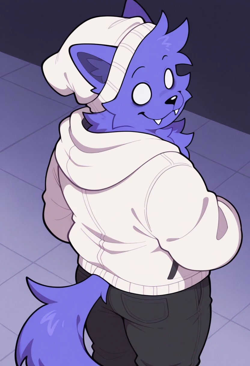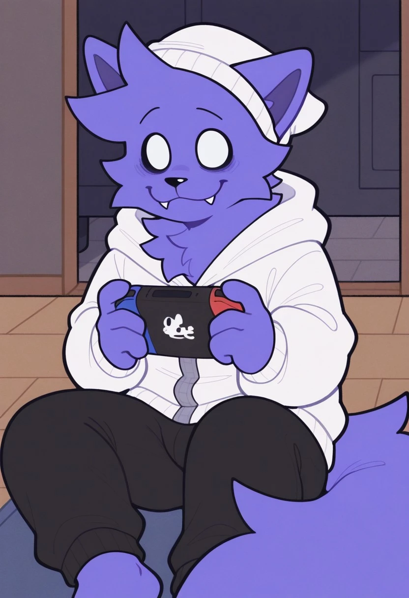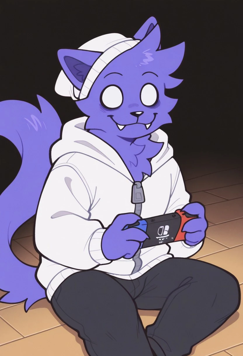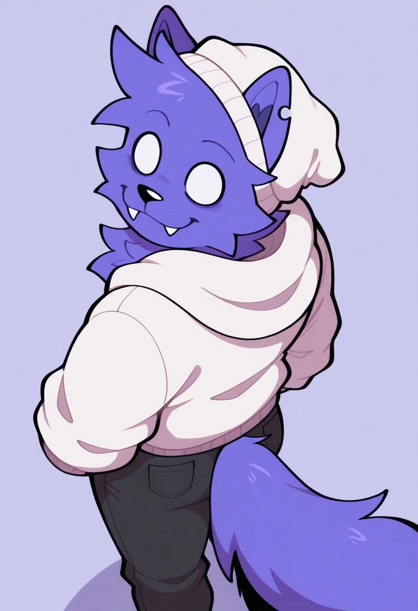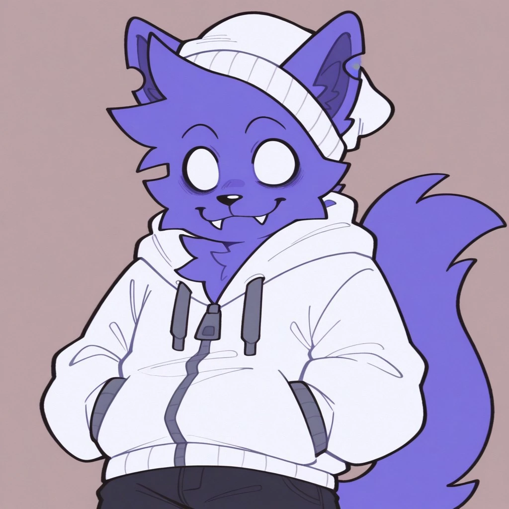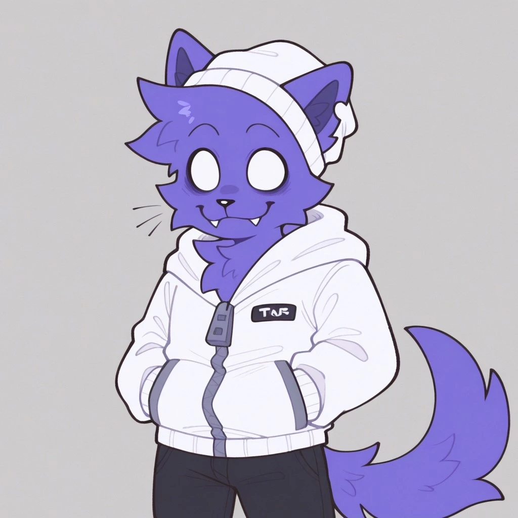 solo,male,anthro cat,purple-blue fur,black nose,white sclera,without pupils,fangs,white beanie,white jacket,black pants, fluffy long tail,cheeks tufts,head tufts, notch ear, without eyebrows, no eyebrows, black eye shadow