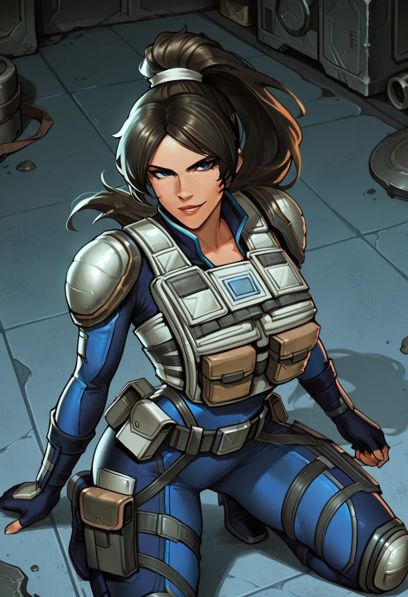 dark hair, high ponytail, long ponytail, blue combat suit, white combat vest, assault rifle