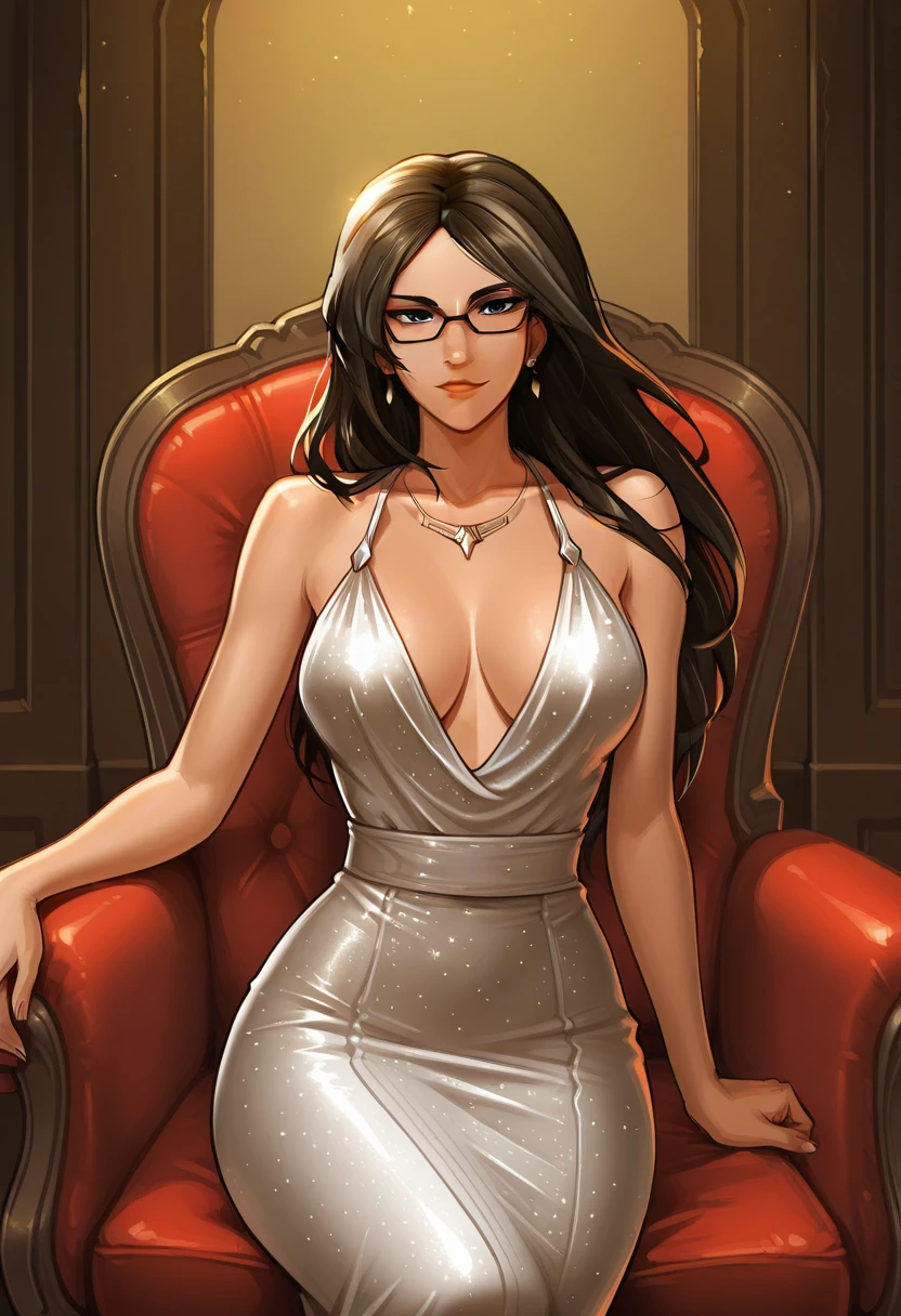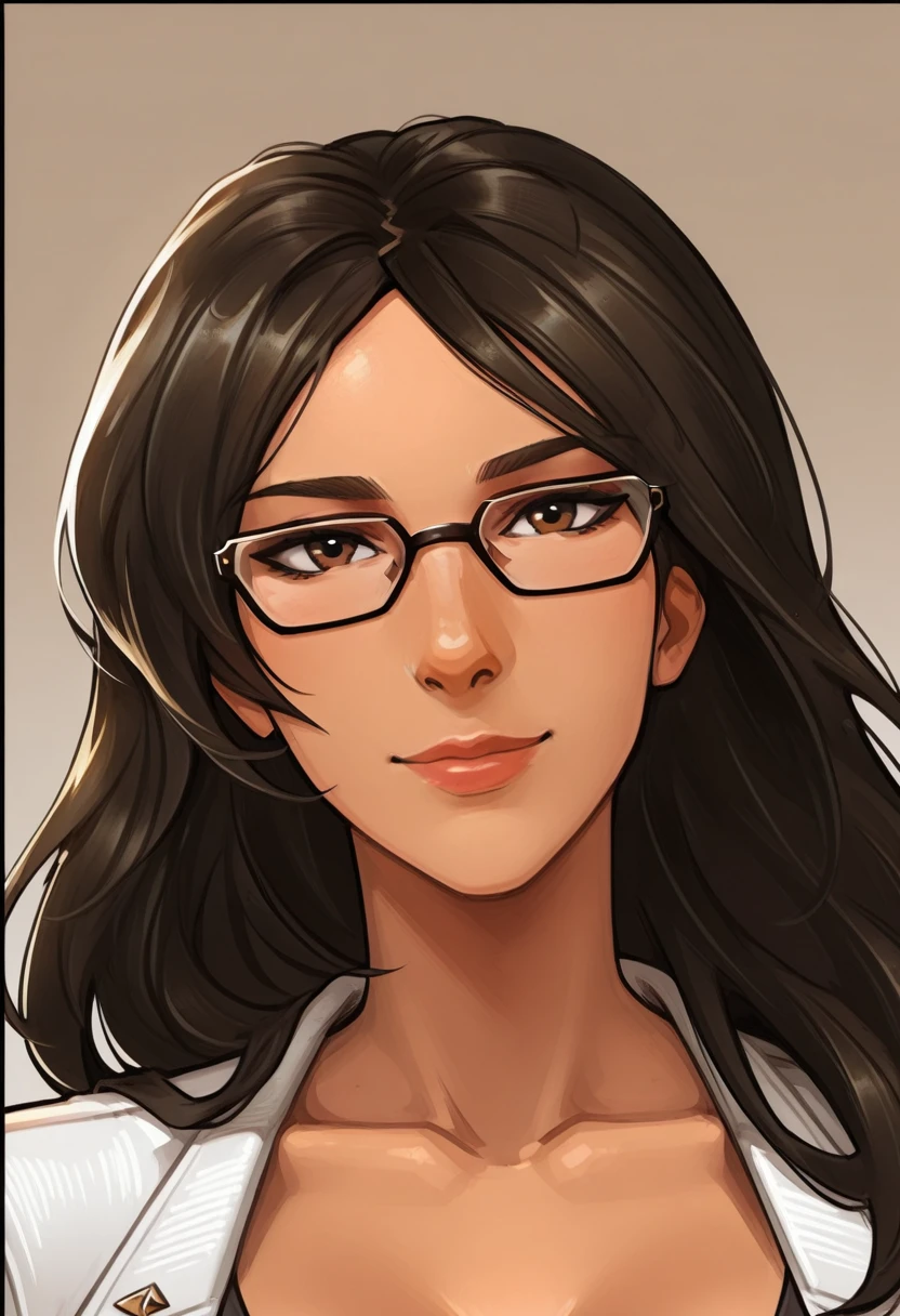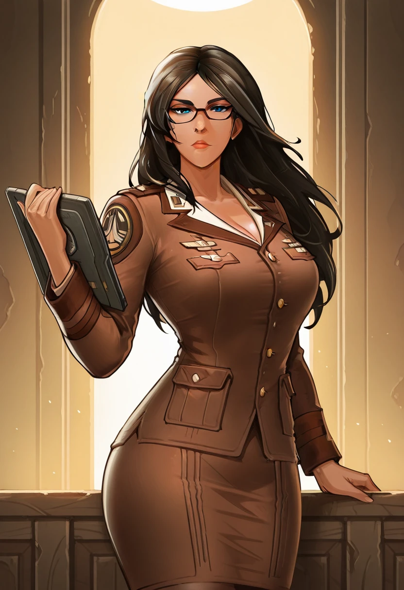 dark hair, long hair, loose hair, brown military uniform, glasses