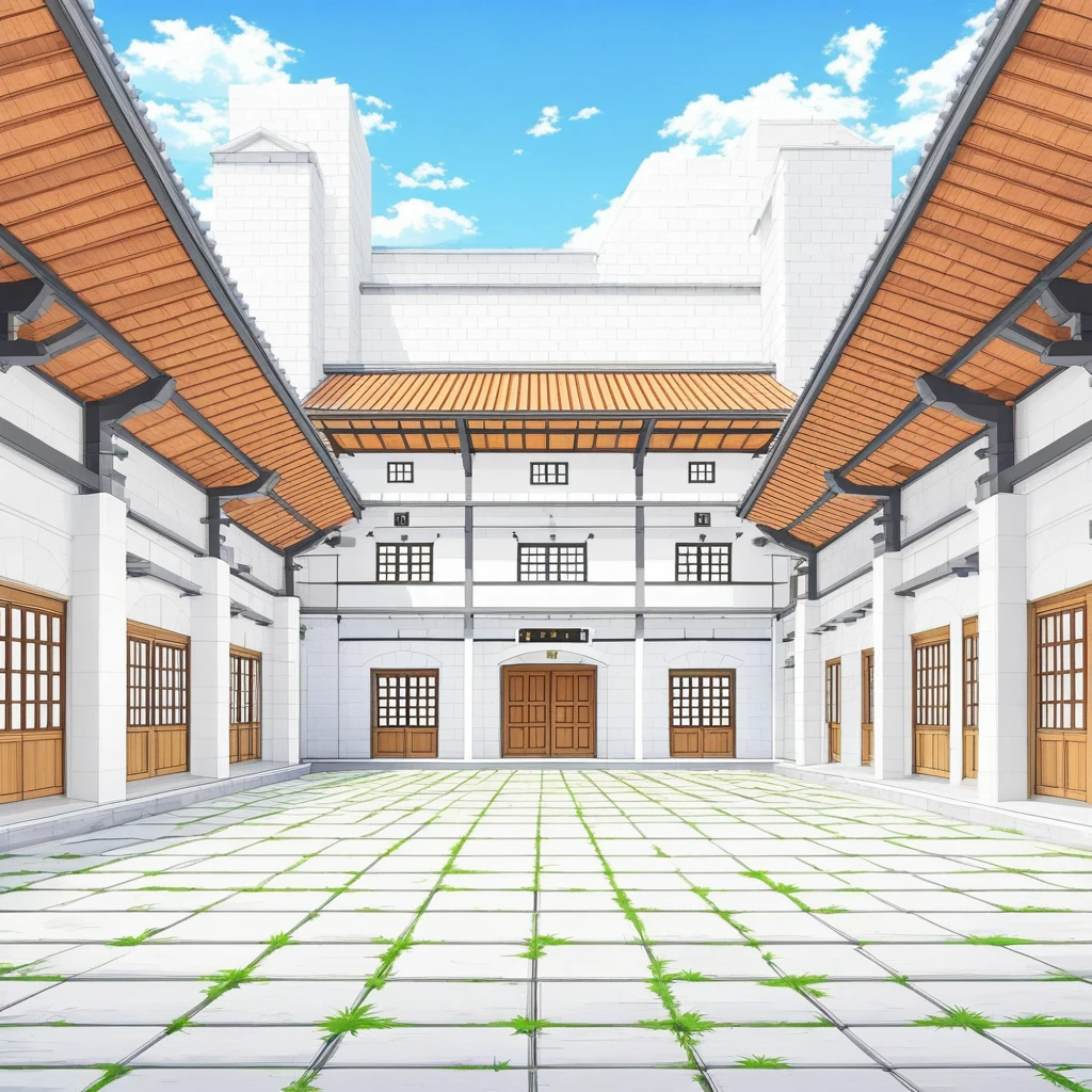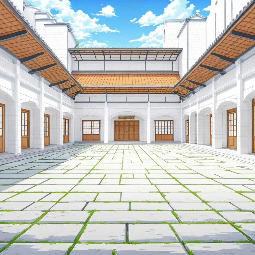 martial arts courtyard, dojo courtyard, training academy exterior, white stone architecture, white brick walls, tiled stone ground, stone tiles with grass, grass between tiles, open courtyard, symmetrical layout, covered walkways, wooden roof structures, wooden beams, dark metal supports, arched windows, wooden doors, arcaded corridors, central open space, training yard, classical dojo style, clean architecture, balanced symmetry, wide angle view, strong perspective, anime environment art, anime background style, crisp lineart, bright daylight, calm atmosphere, environment focus