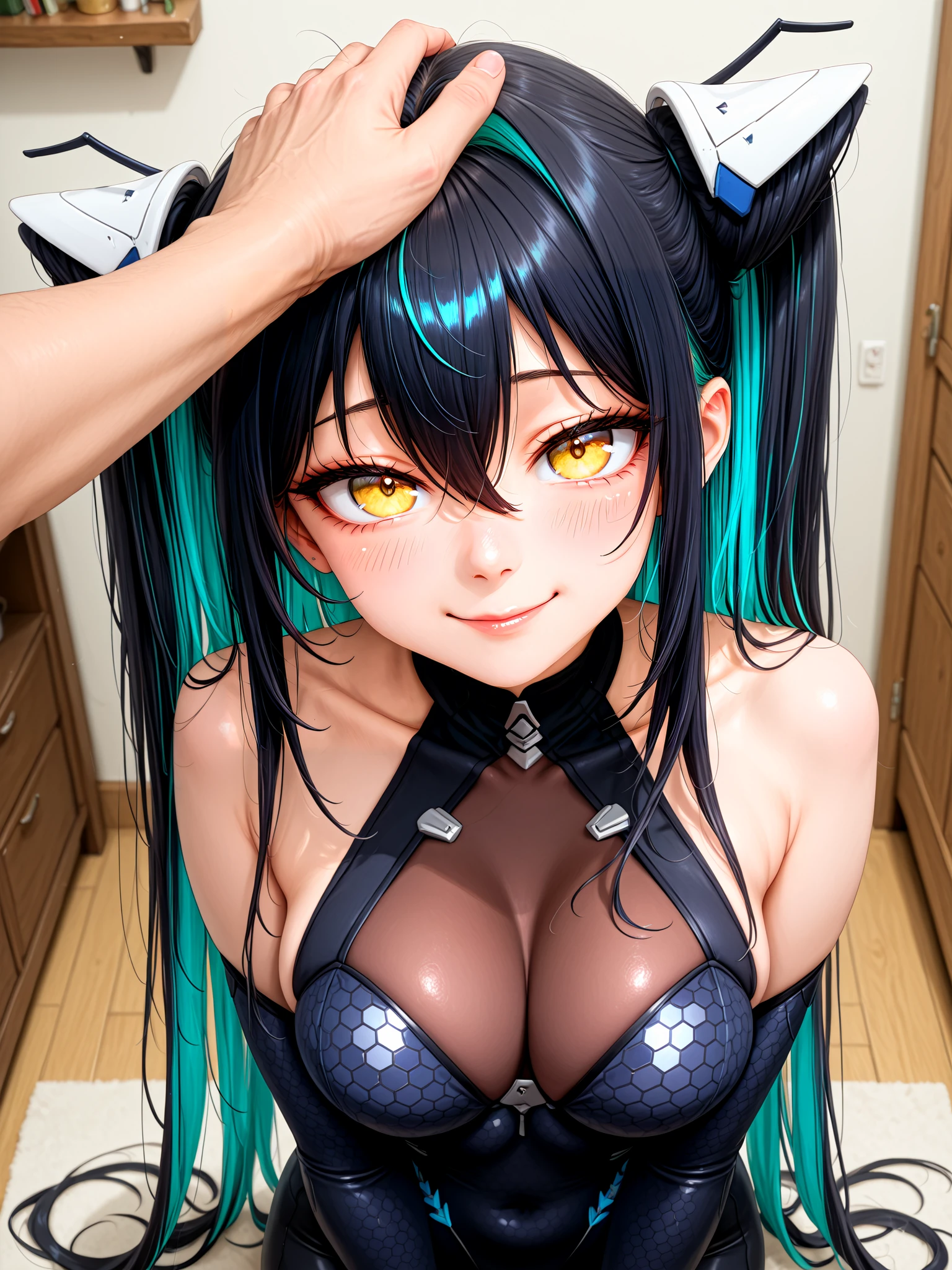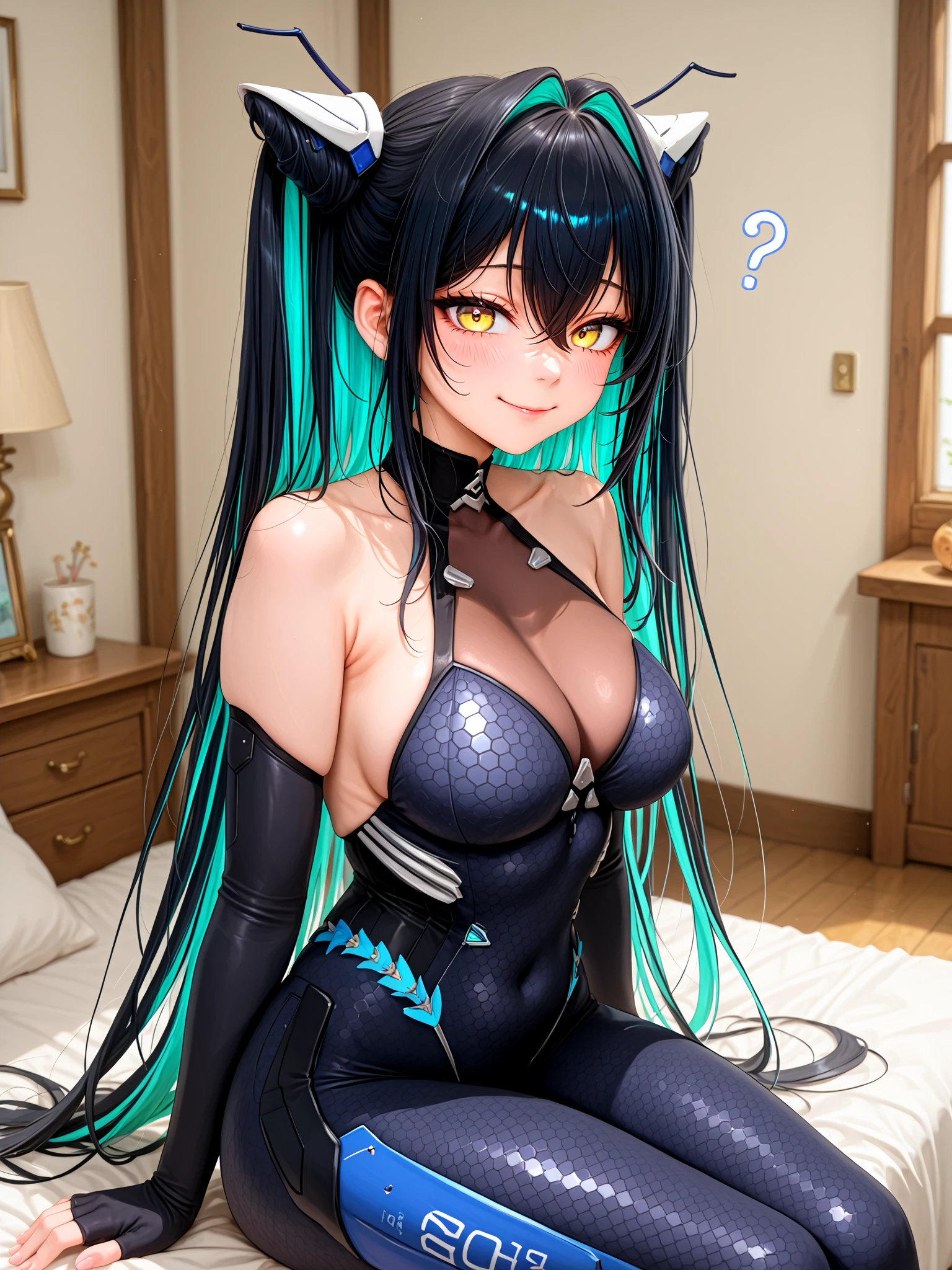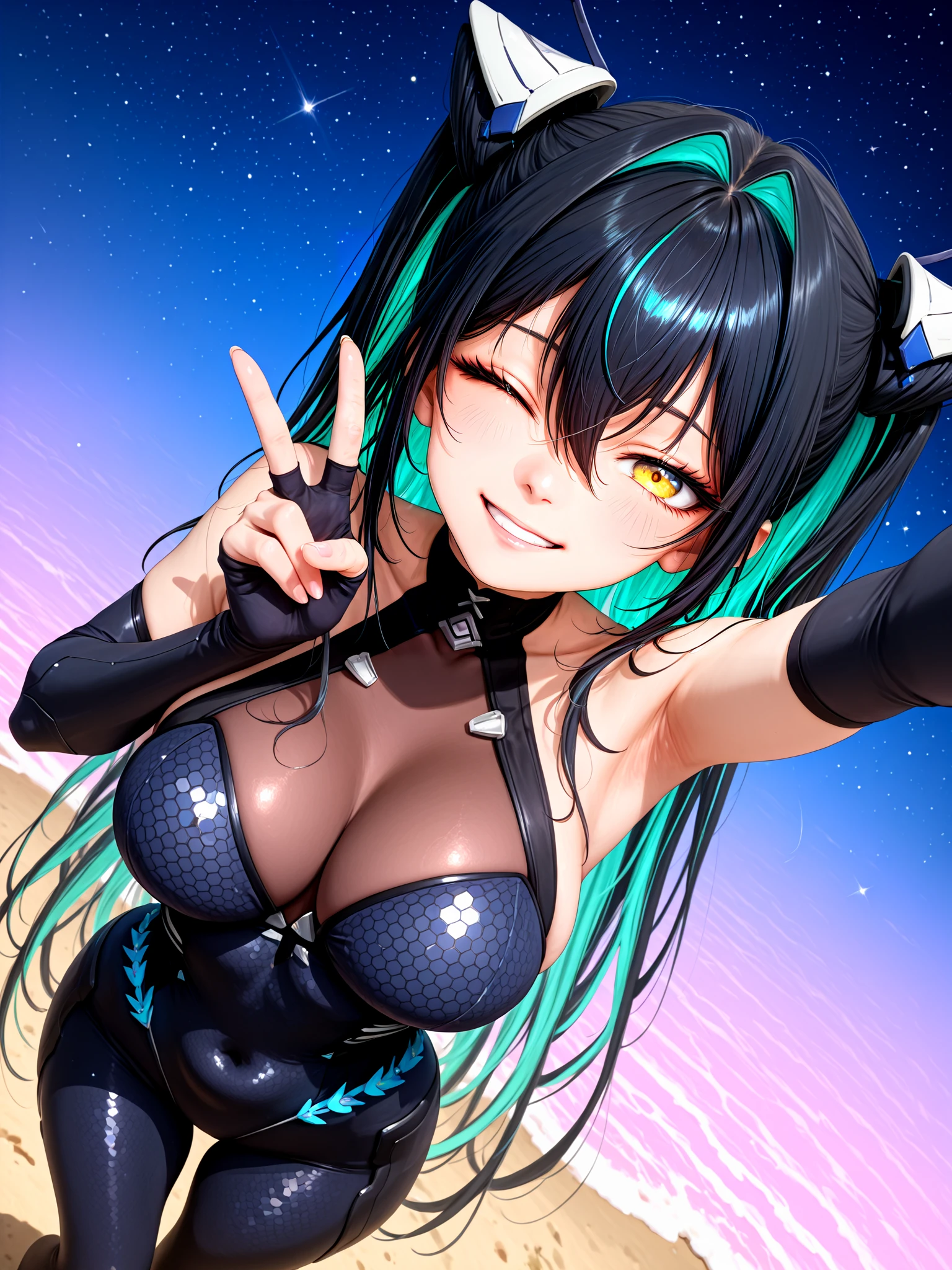 sirenlittlemermaidnikke, very long hair, hair intakes, twintails, hair between eyes, multicolored hair, colored inner hair, two-tone hair, black hair, aqua hair, yellow eyes, large breastsblack bodysuit, backless bodysuit, halterneck, covered navel, bare shoulders, gloves, hexagon print, honeycomb \(pattern\), honeycomb printDescription