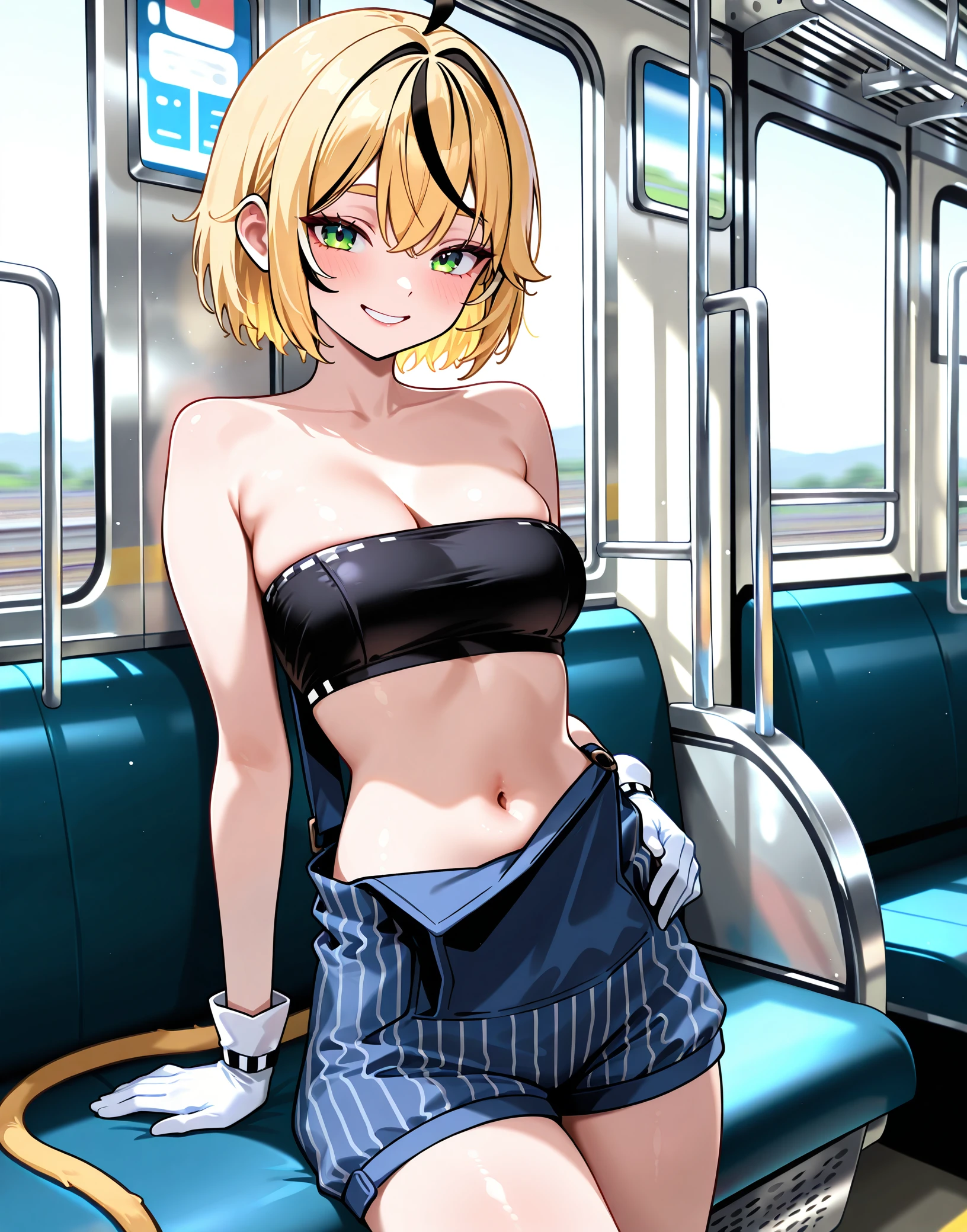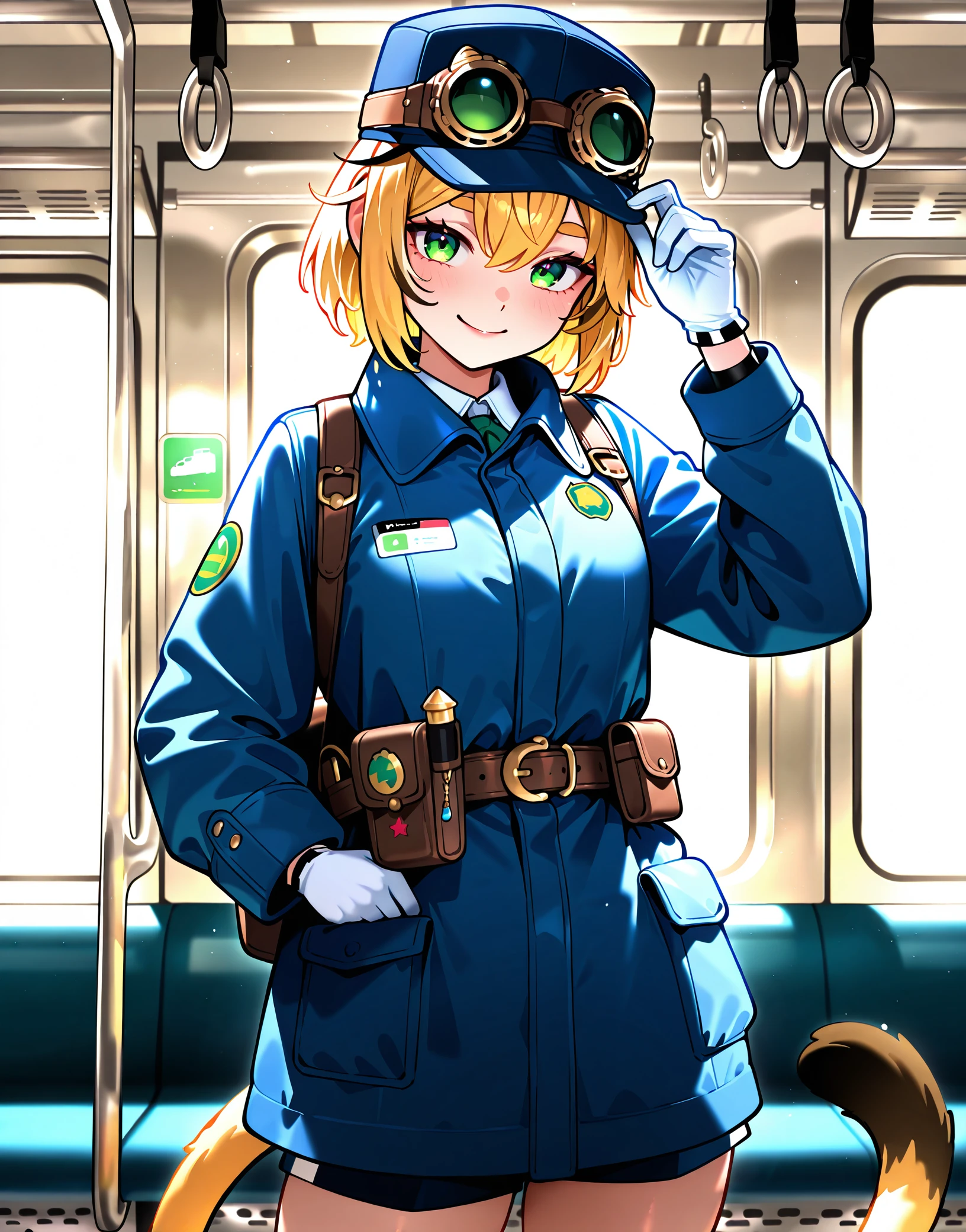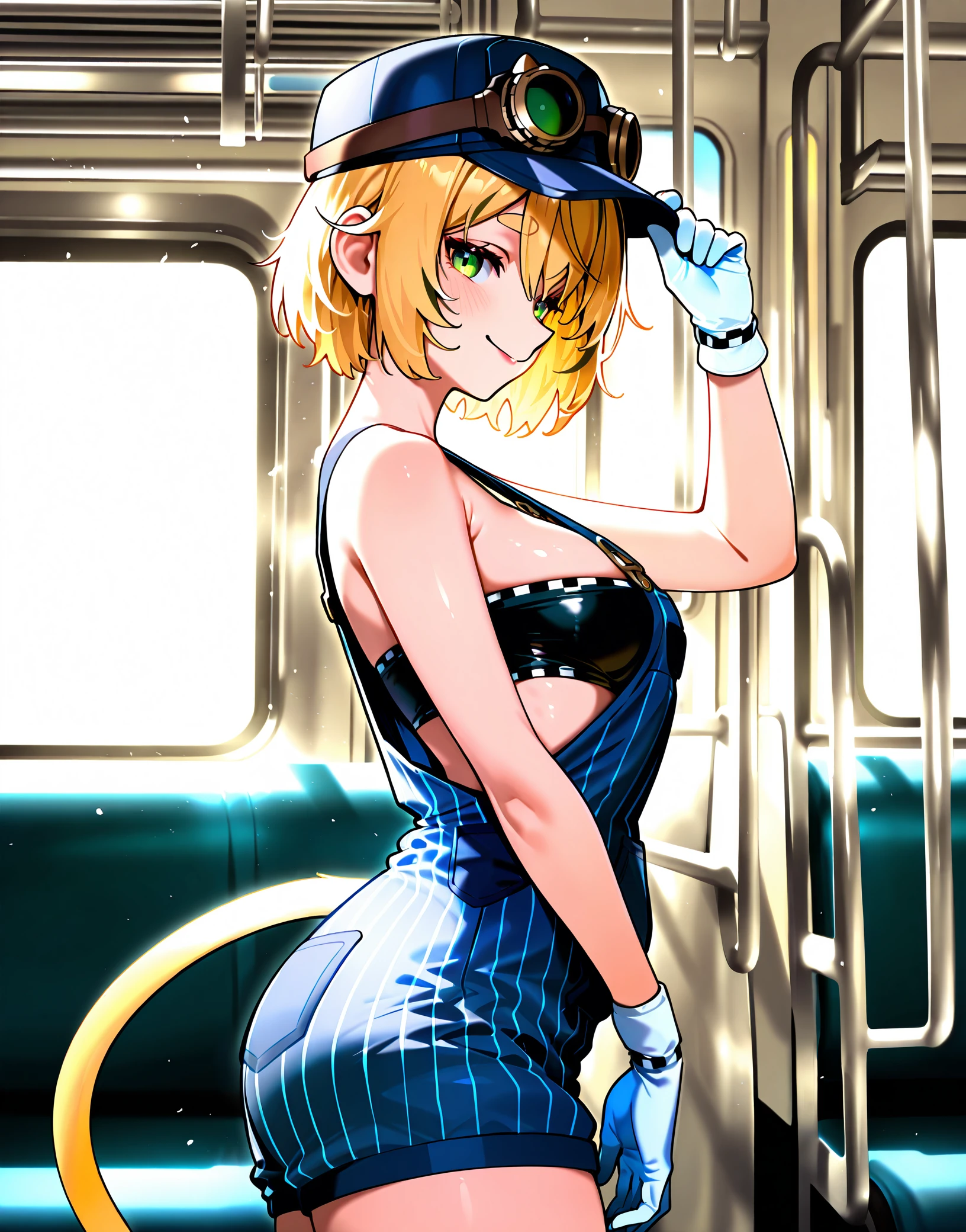 dooby, hat, goggles on headwear, gloves, jacket, overalls, tube top, navel, overall shorts, naked overalls,