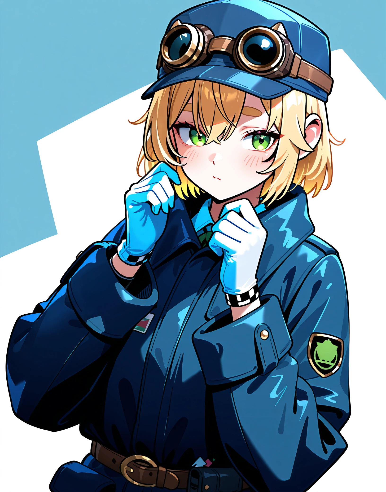 dooby,hat, goggles on headwear, gloves,jacket,overalls,tube top, navel, overall shorts,naked overalls,
