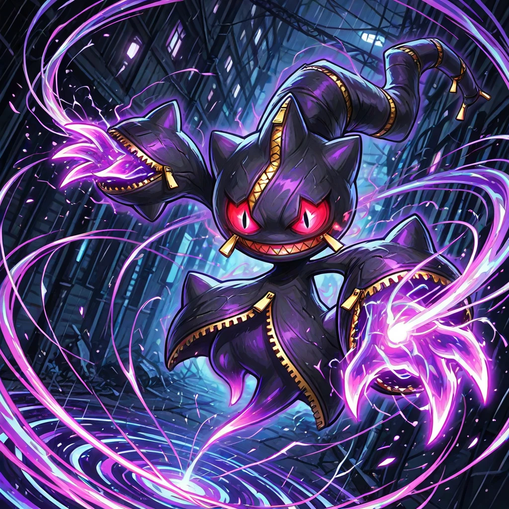 Mega_Banette, red eyes, sharp teeth, zipper, zipper pull tab, energy body from open zipper,