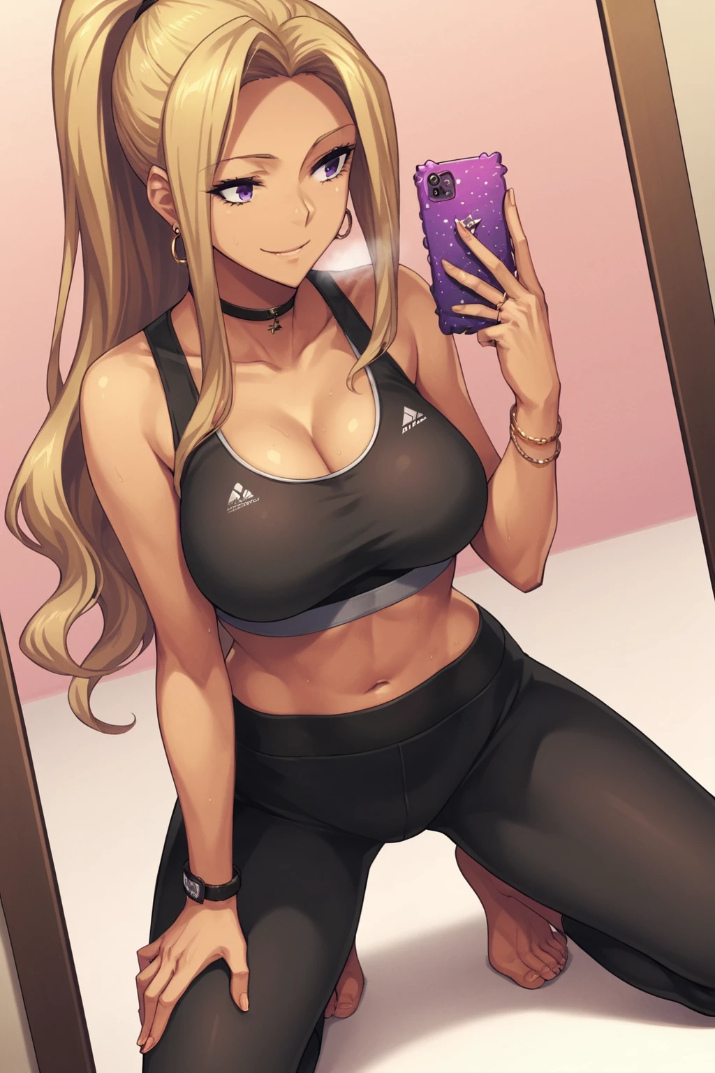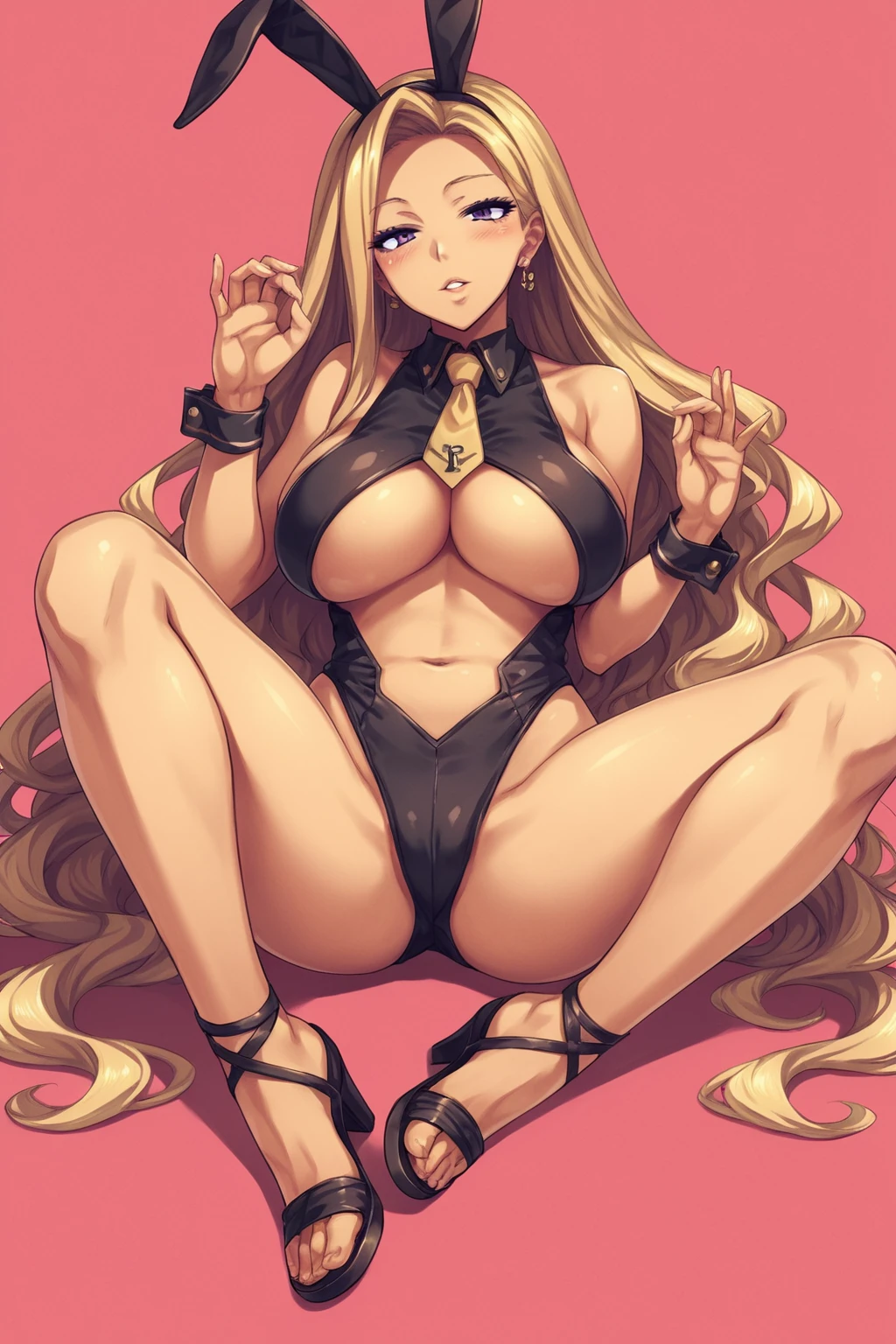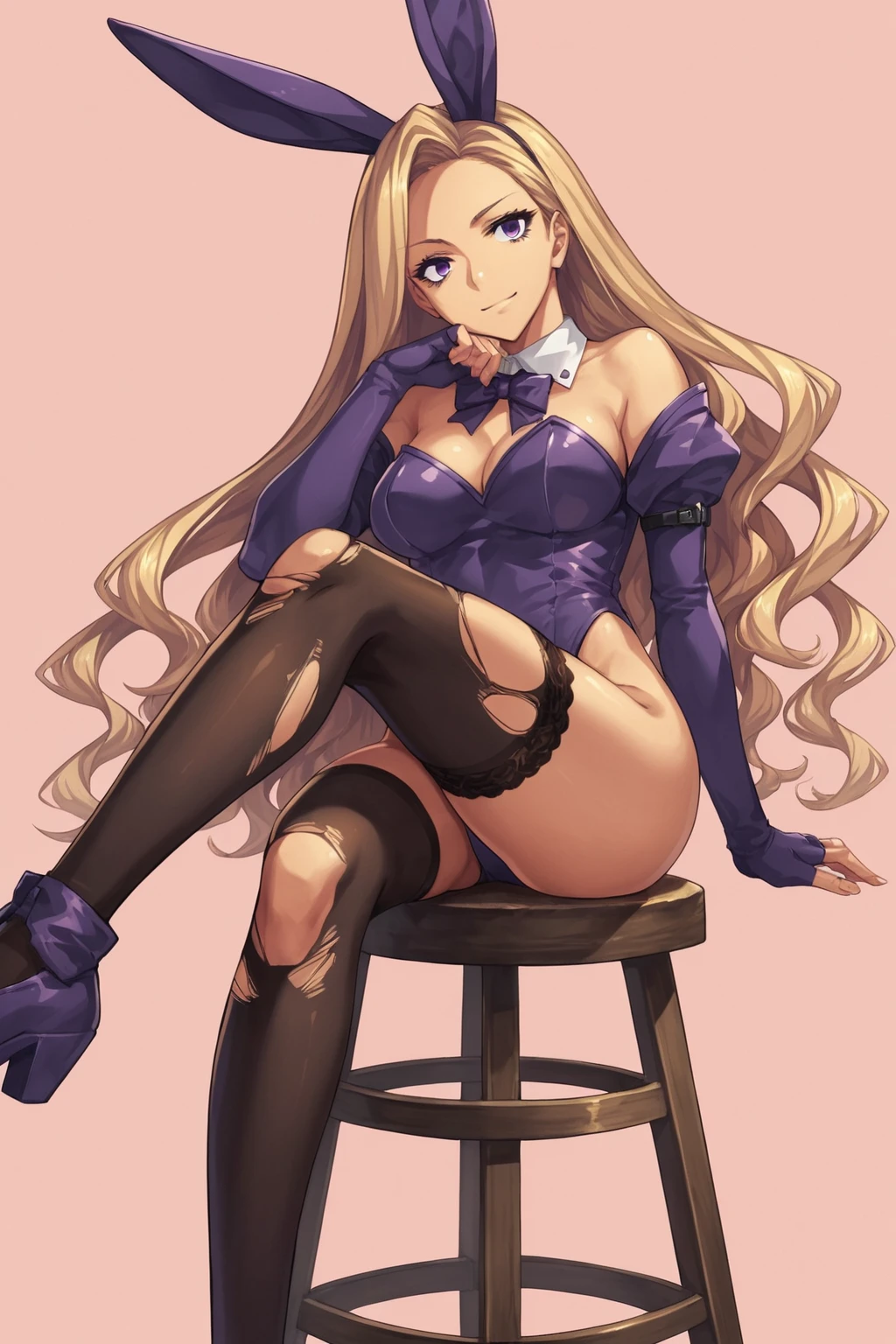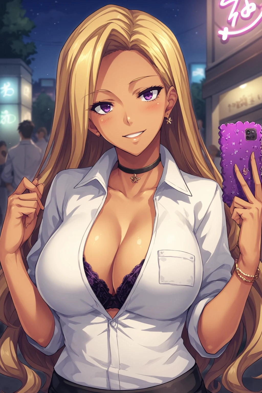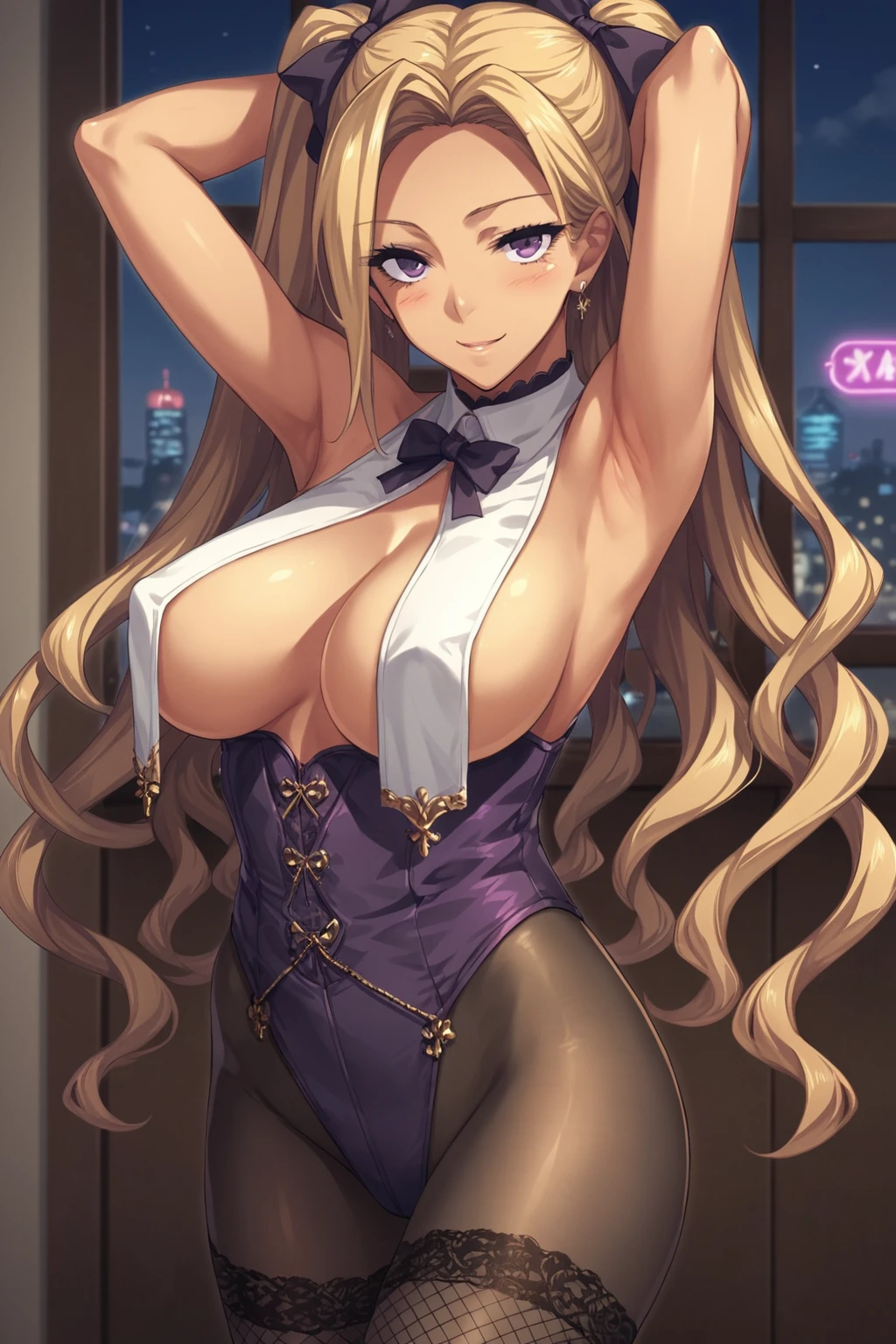 blonde hair, very long hair, purple eyes, large breasts