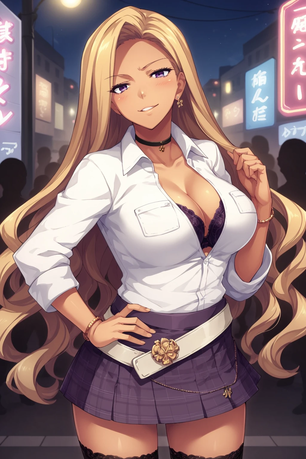 collared shirt, choker, bra peek, microskirt, belt, bracelet, black thighhighs, earrings