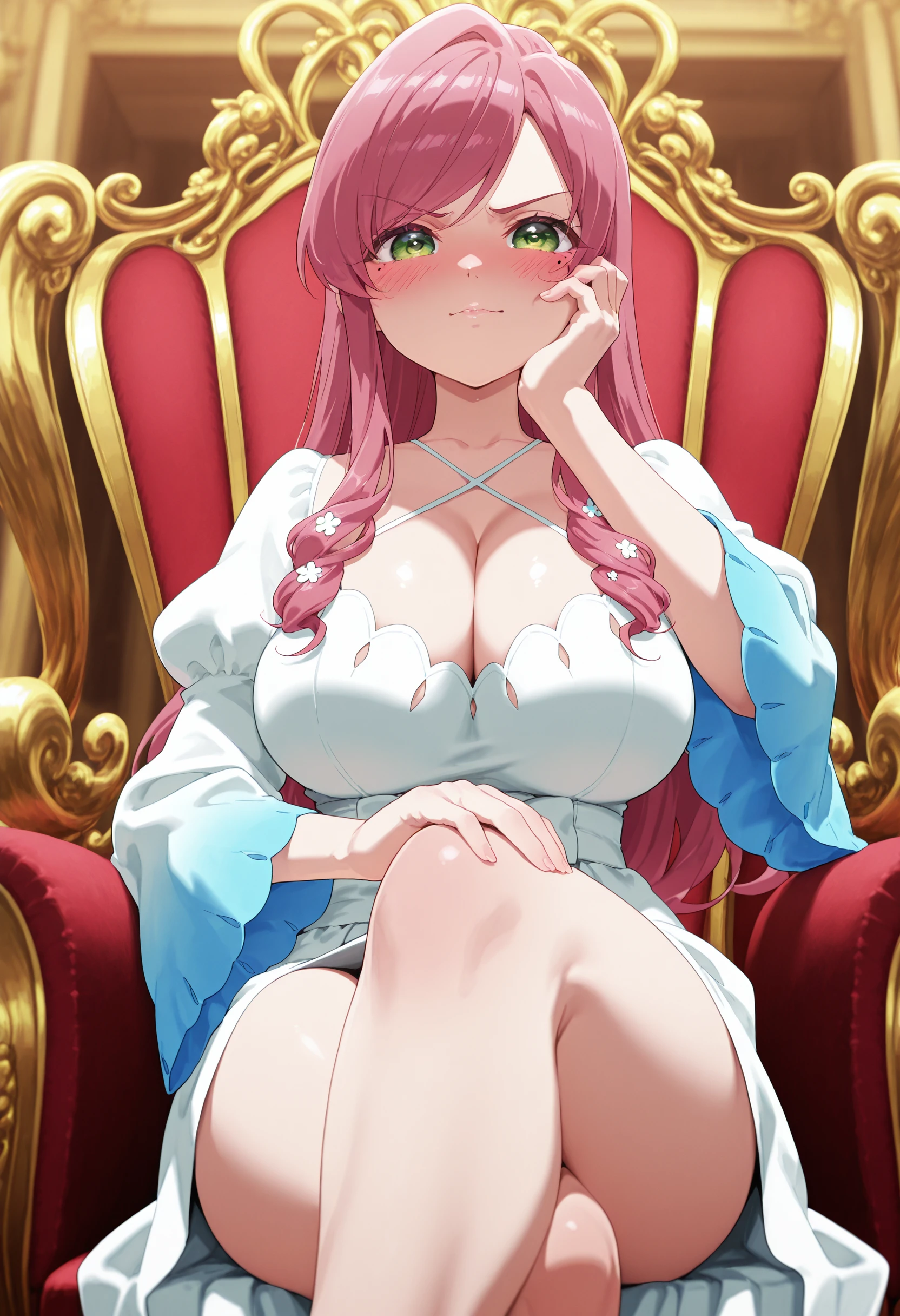 hanazonohahari, green eyes, mole under eye, pink hair, long hair, large breasts, cleavage, blush, lips, hair flowers,