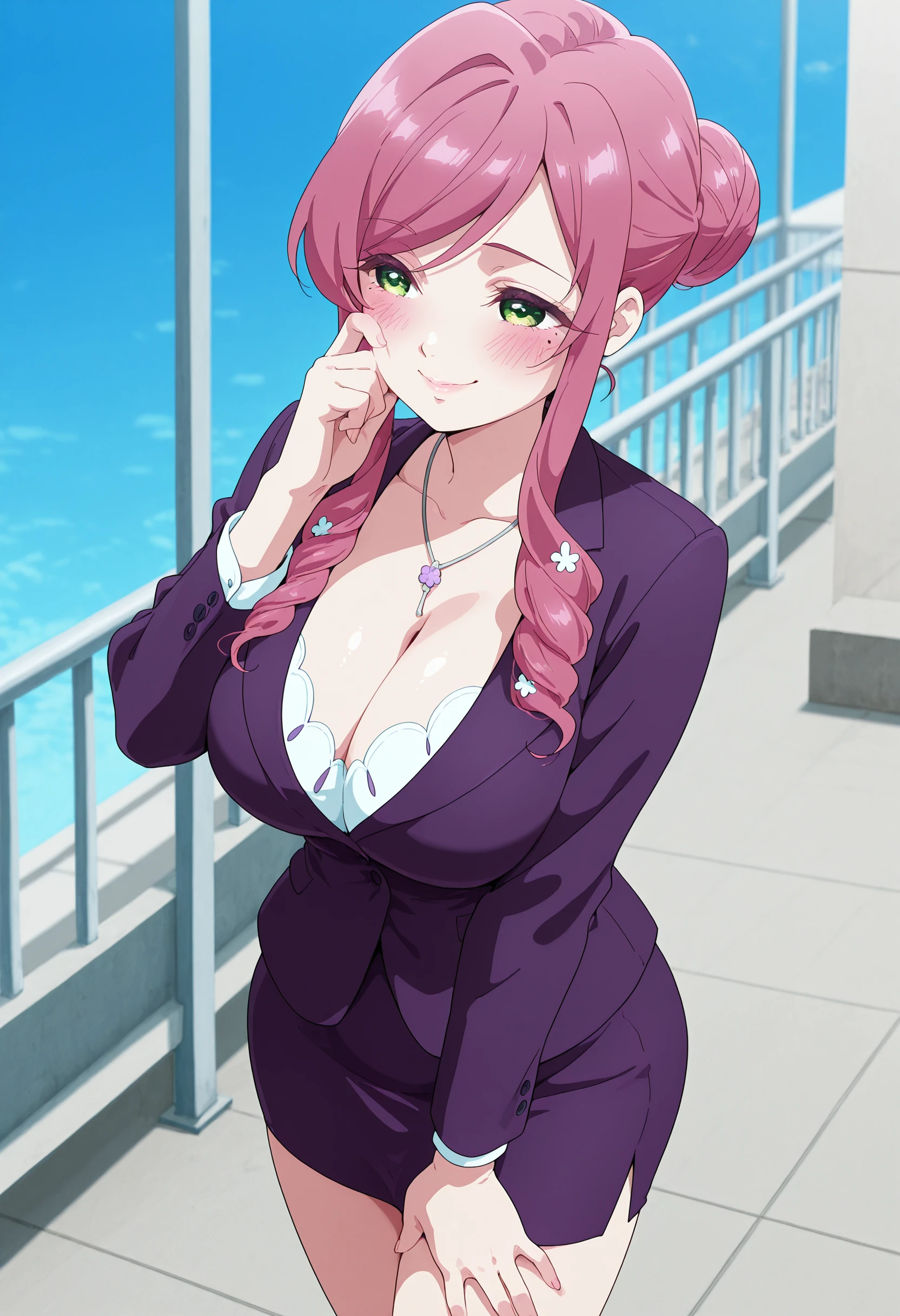 purple business suit, purple skirt, high heels, hair bun, necklace,