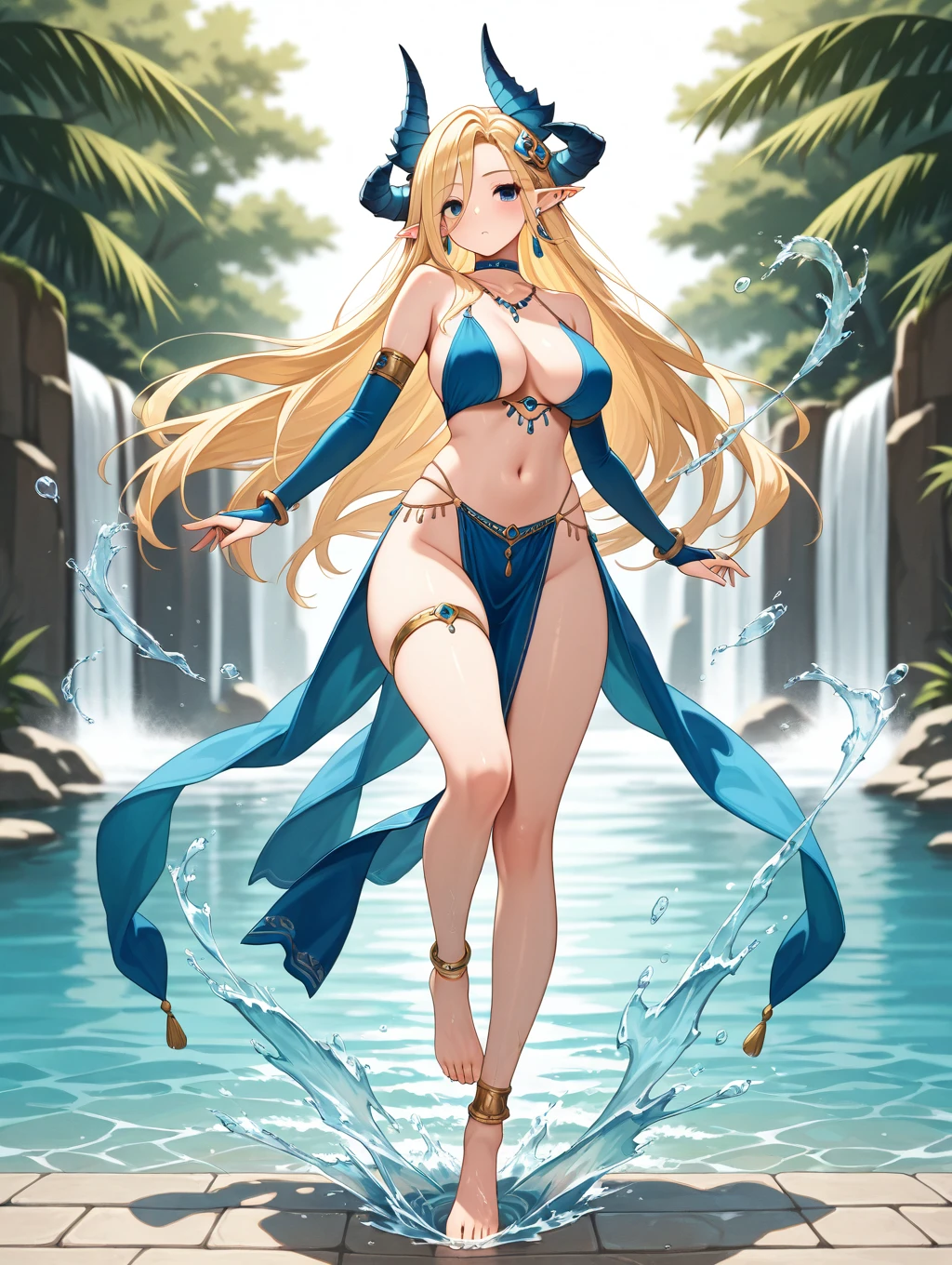 bianca, 1girl, solo, long hair, blue eyes, blonde hair, large breasts, hair ornament, gloves, tail, ahoge, wings, horns, pointy ears, pants, white gloves, hair over one eye, ascot, dragon wings, blue horns