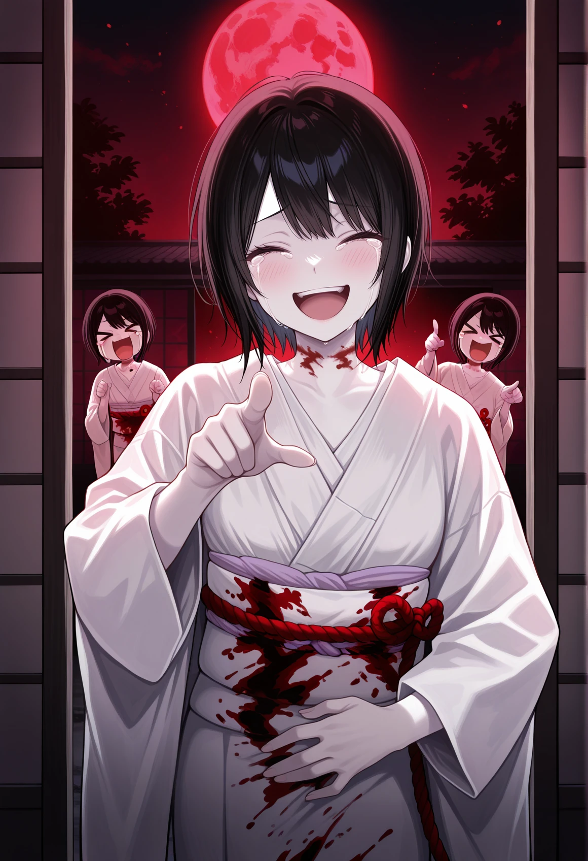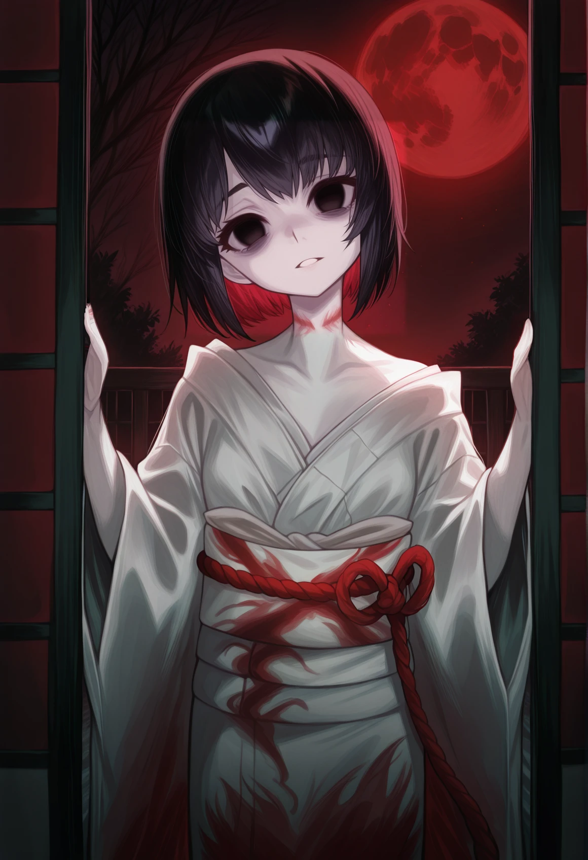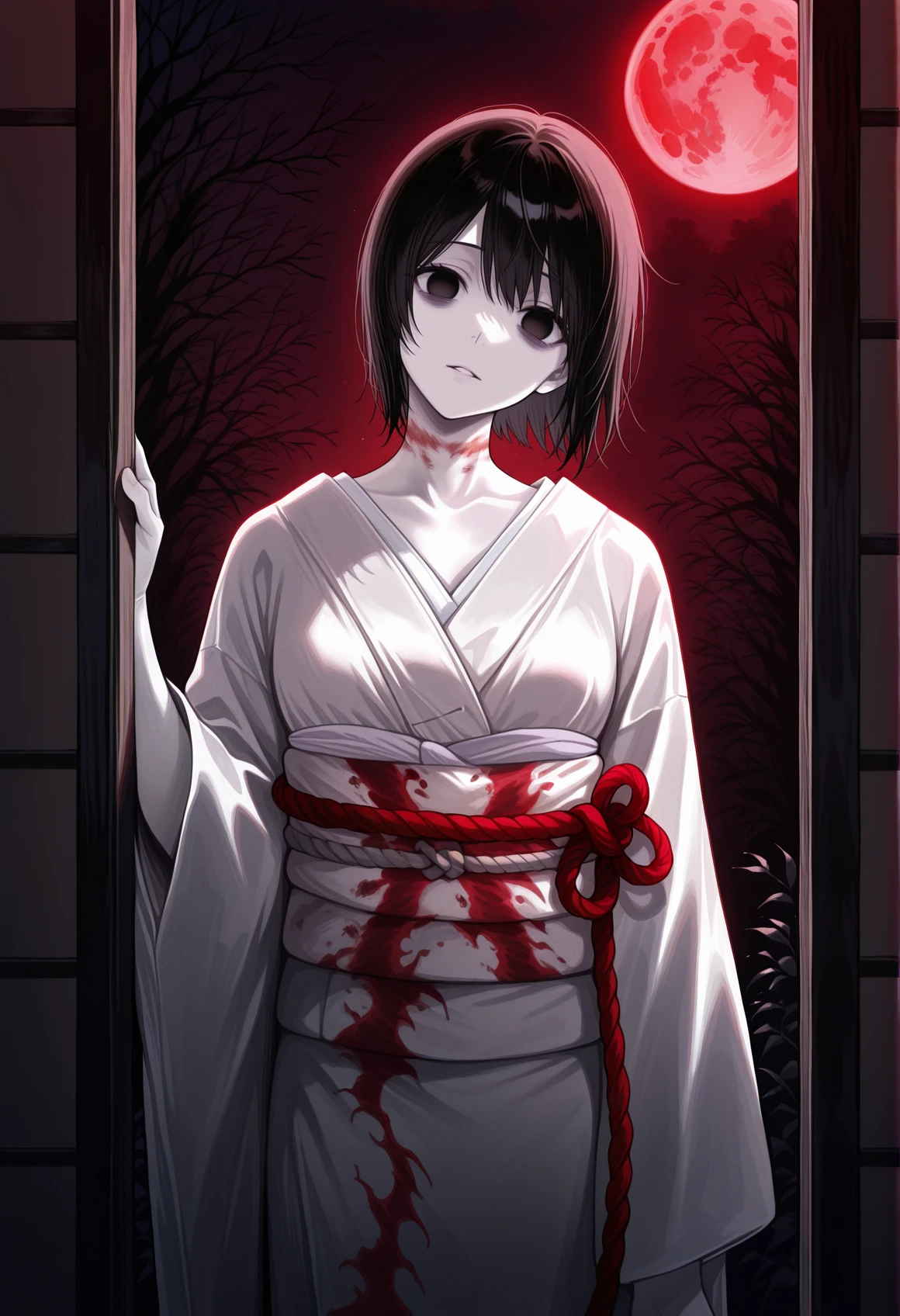 black hair, neck mark, short hair, black eyes, white kimono, obi, rope, pale skin