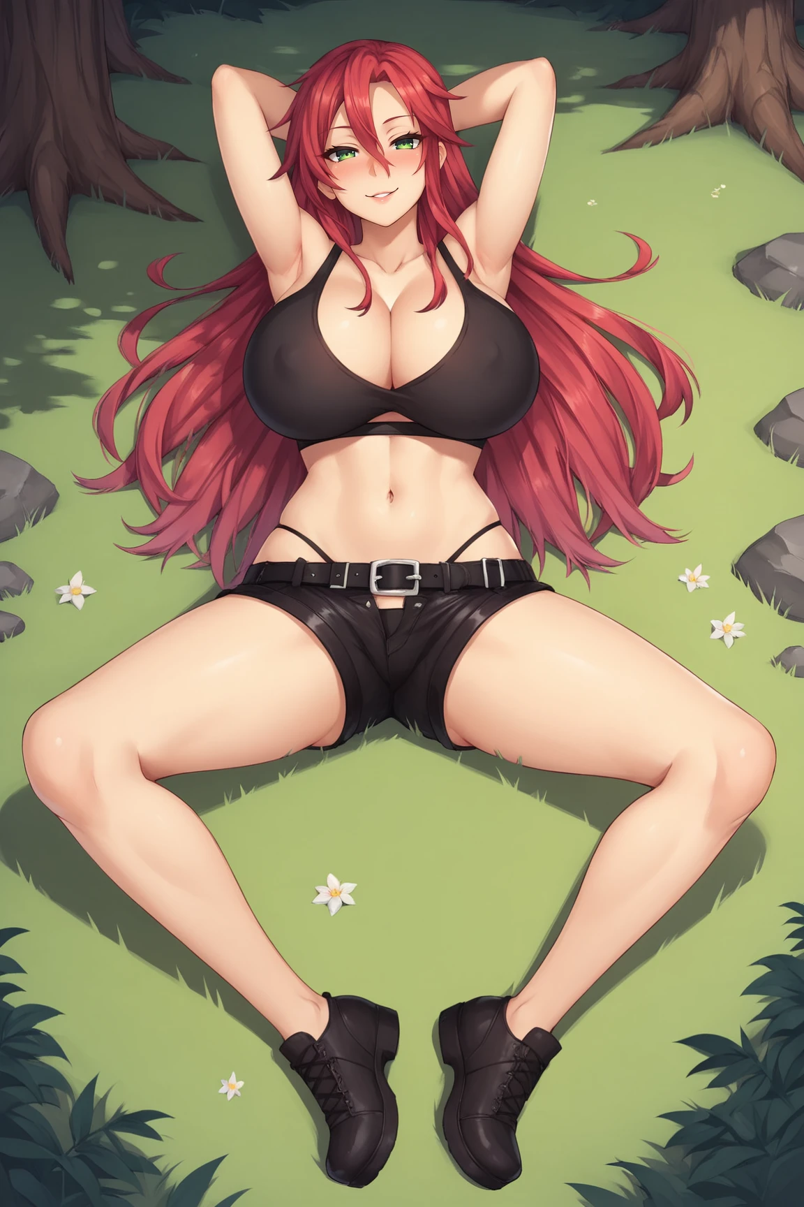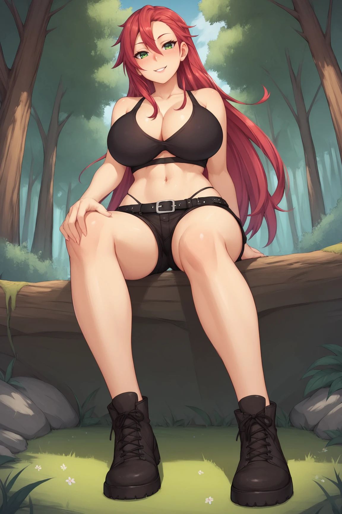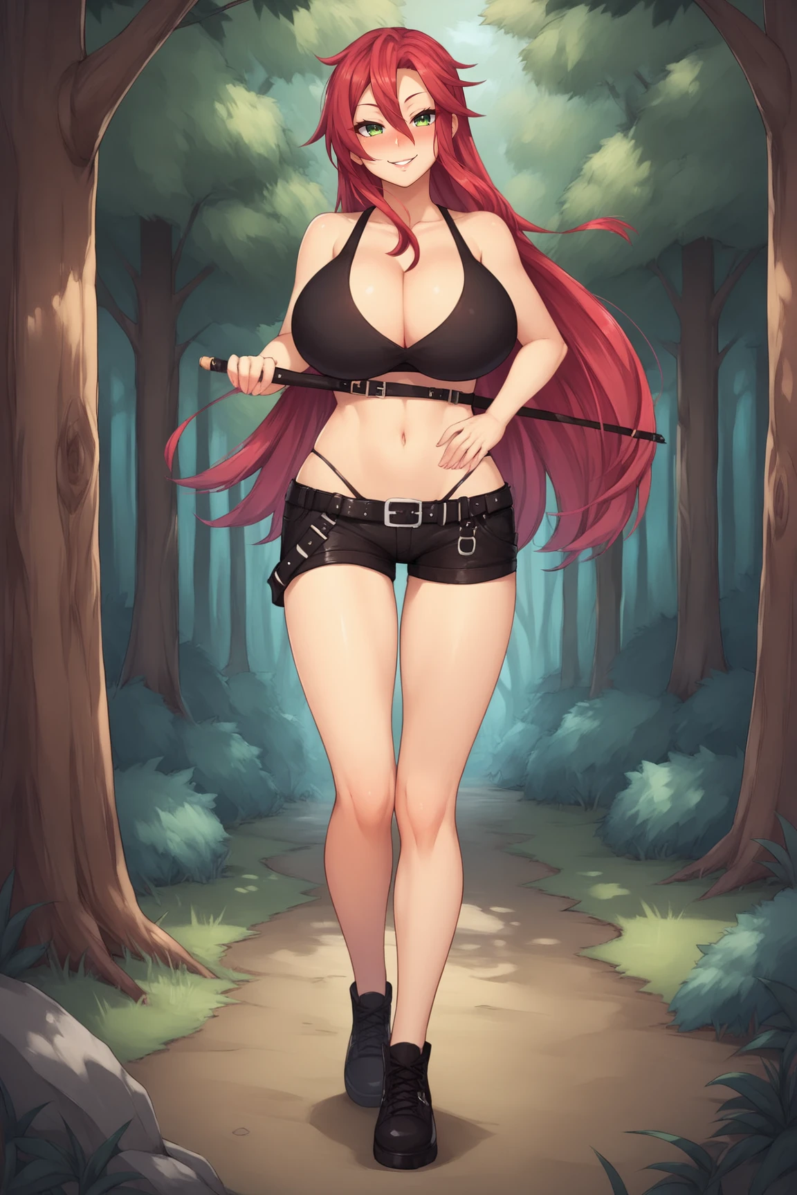 ➜ MichelleTTPXL, green eyes, red hair, long hair, hair between eyes, huge breasts, cleavage, black midriff, black highleg panties, black belt, black shorts, short shorts, black shoes