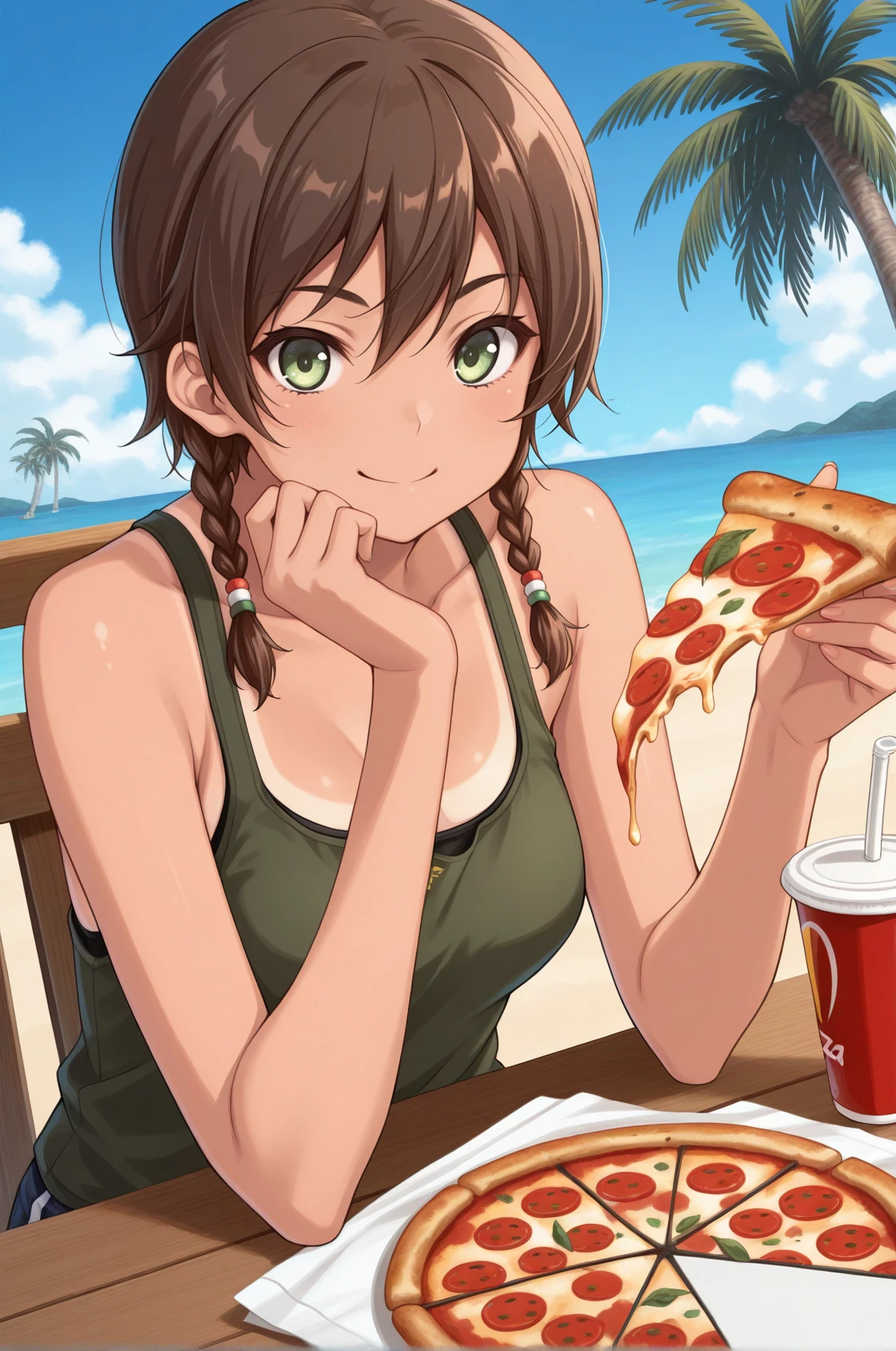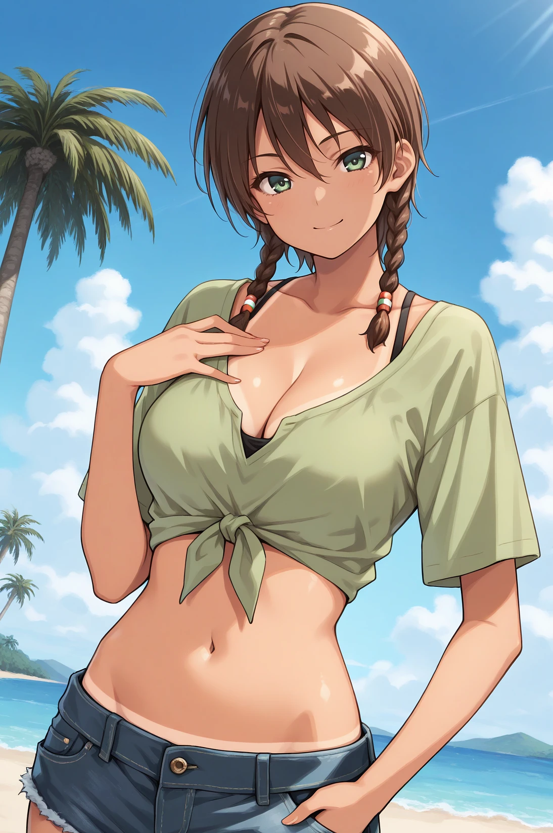 m1k4, tan, tanlines, green eyes, short hair, brown hair, twin braids, hair beads