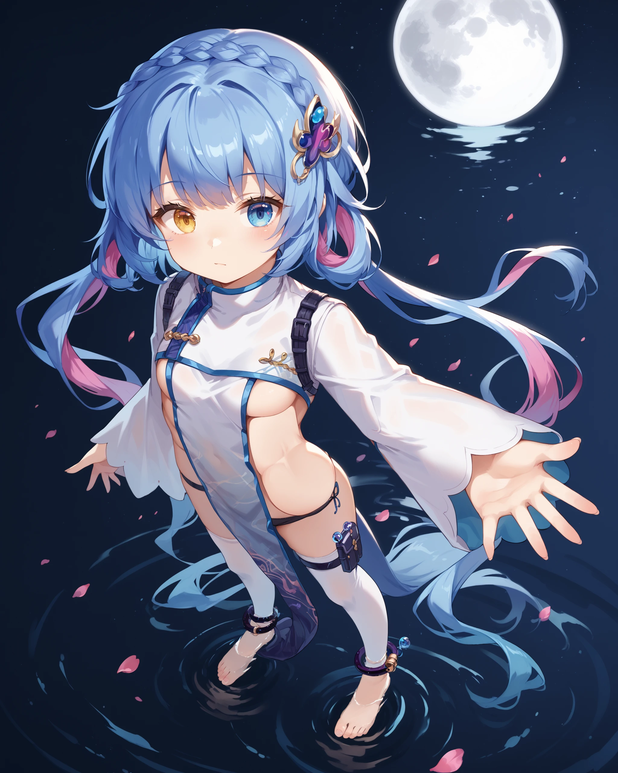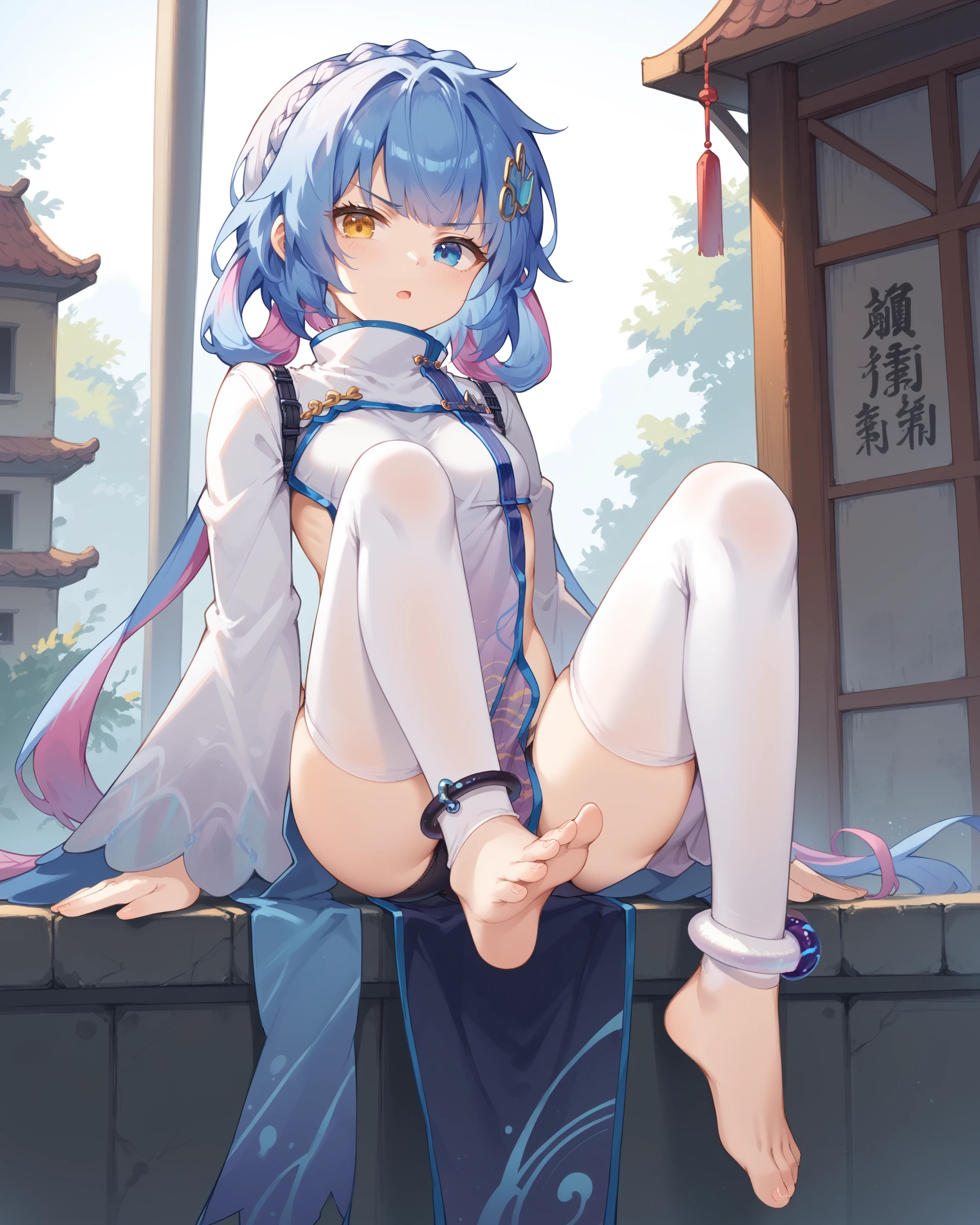 - fish hair ornament, chinese dress, shoulder harness, bell sleeves, black panties, thigh strap, foot bangles, feet, white toeless thighhighs,
