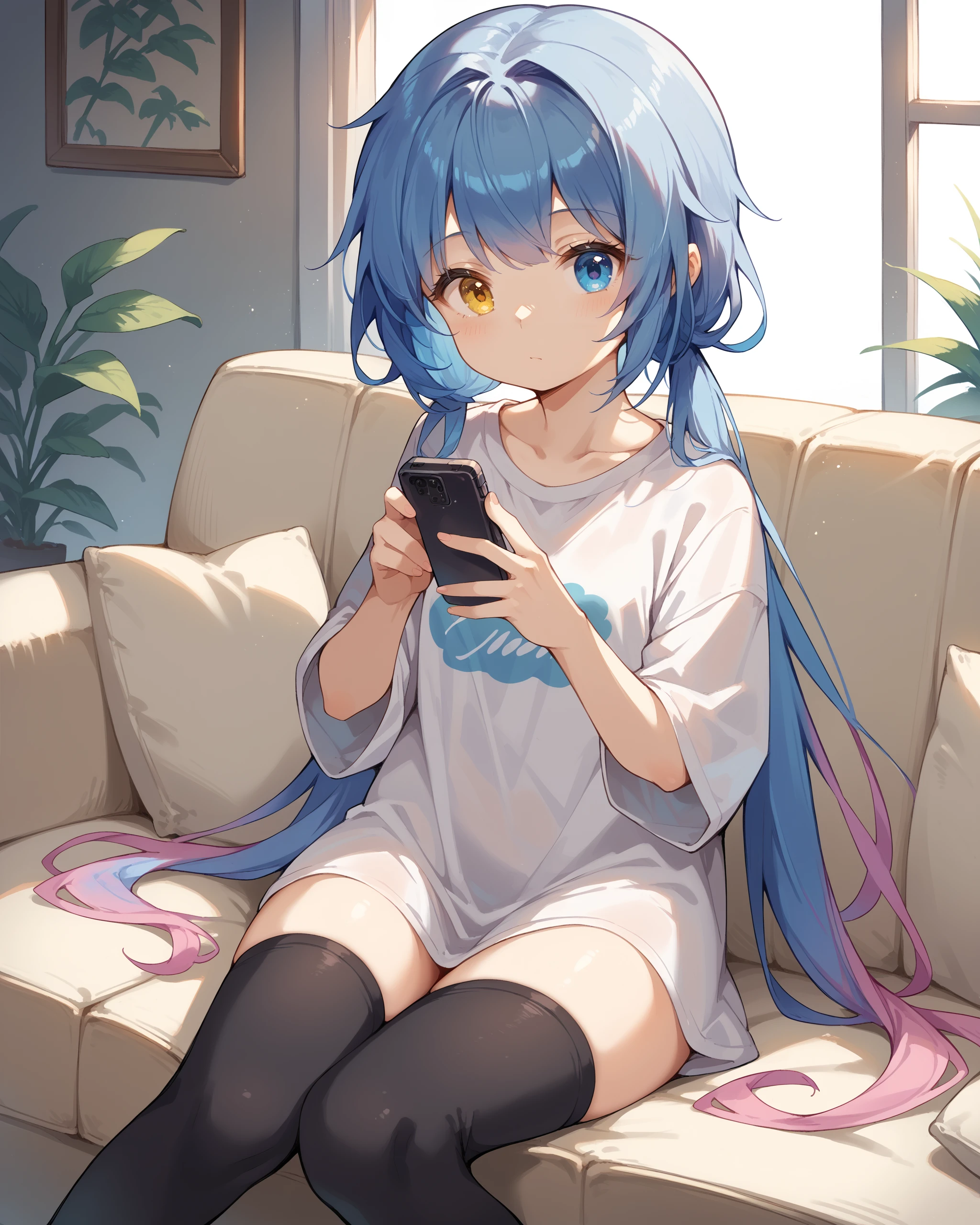- SPP1, long hair, blue hair, low twintails, crown braid, pink hair highlights, hair loop, blue eyes, heterochromia, gold eye,