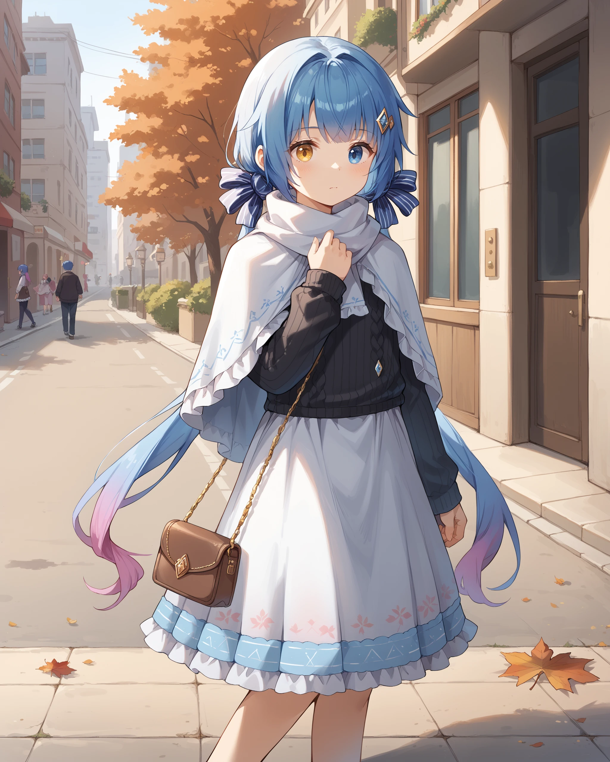 - diamond hair ornament, blue hair ribbon, white scarf, white capelet, black sweater, long sleeves, white skirt, frilled dress, ribbon-trimmed clothes, fur trim, fur boots, brown handbag,
