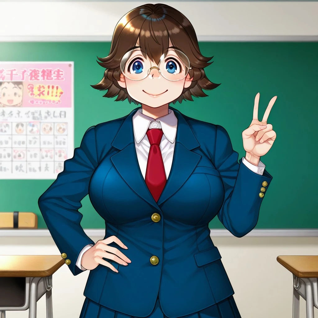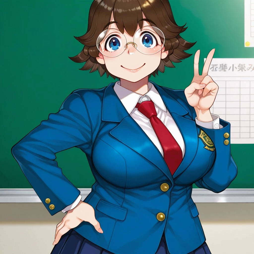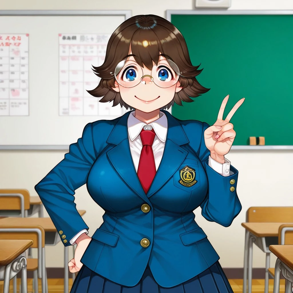 brown hair, short hair, blue eyes, fair skin, large breasts, round glasses,
