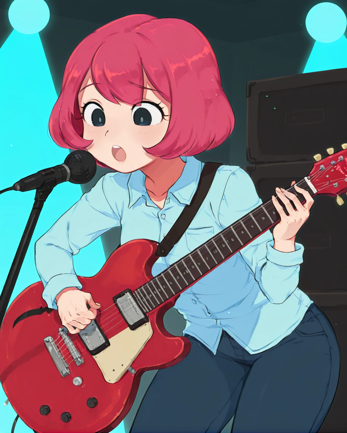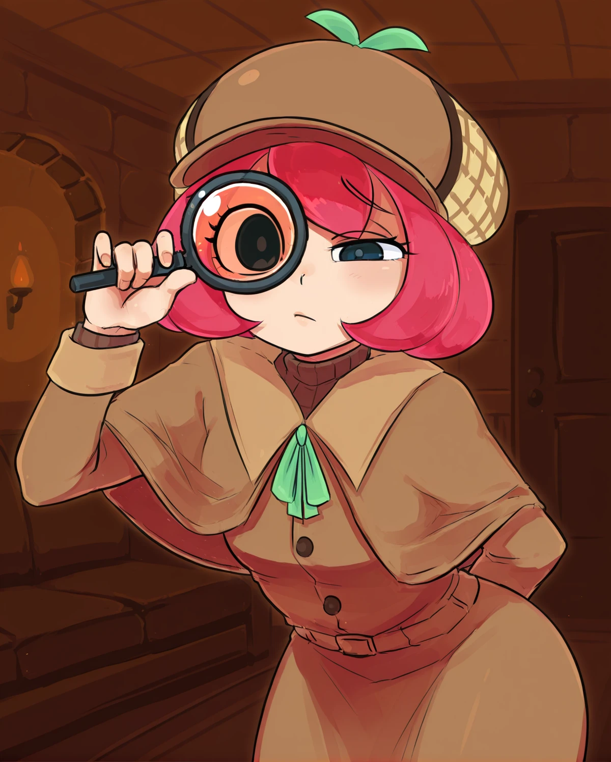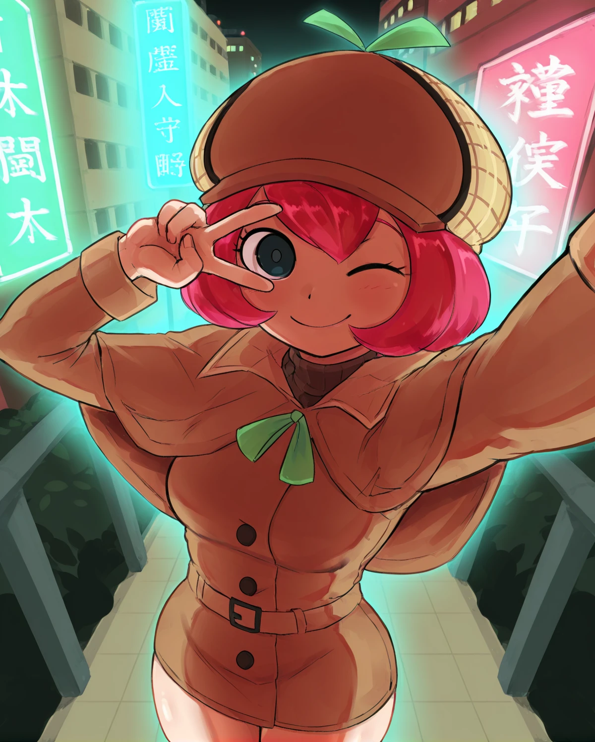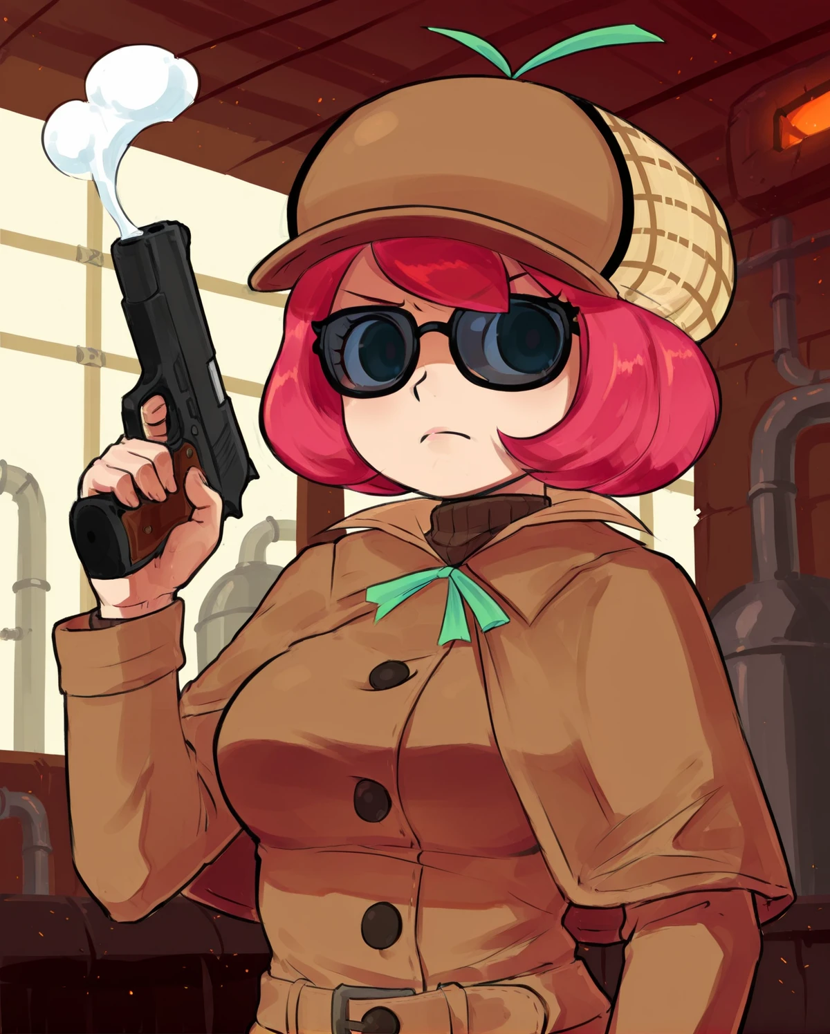 short hair, pink hair, black eyes, deerstalker, brown capelet, green ribbon, brown trench coat