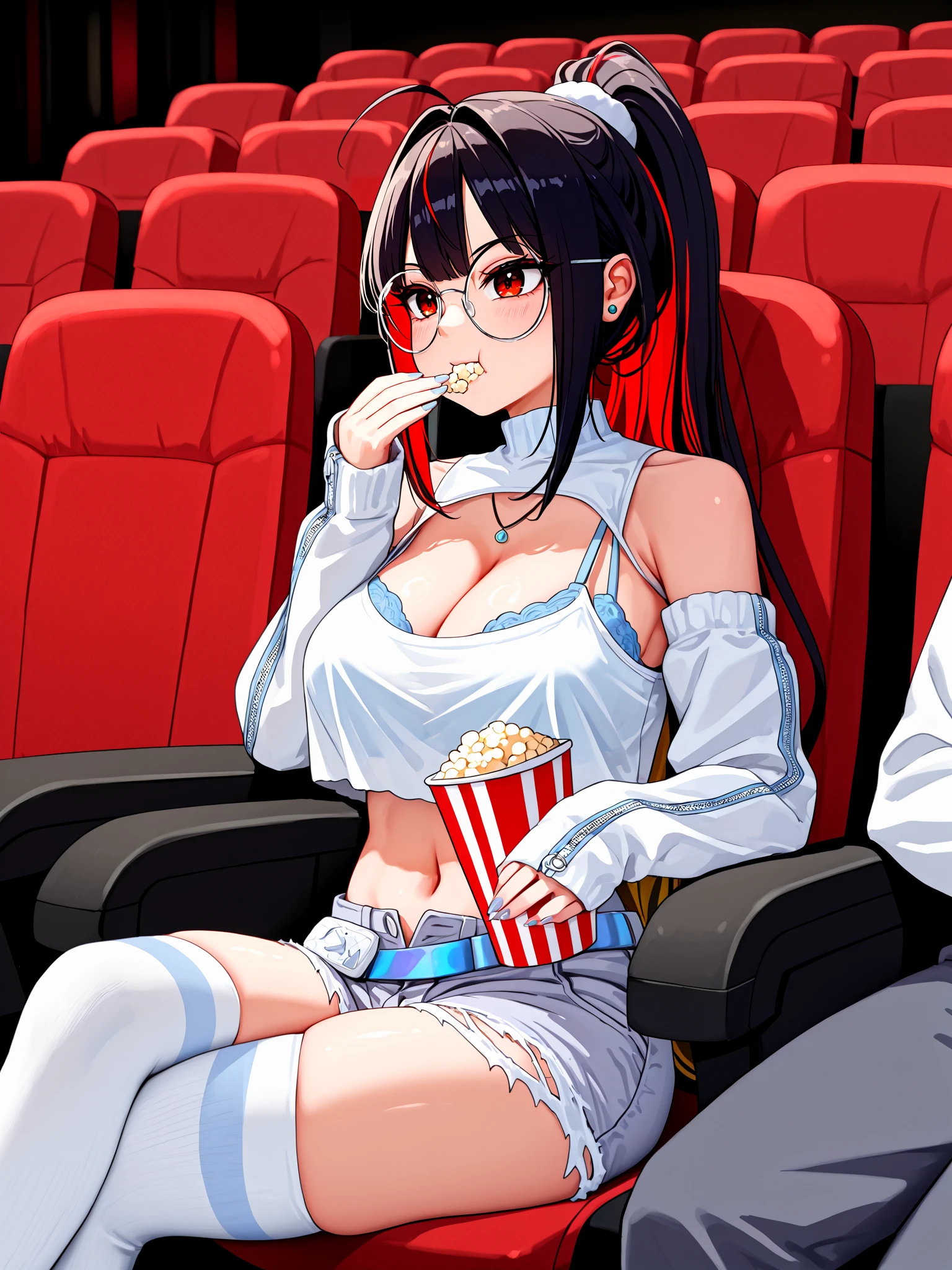 moranoffdutyqueenred eyes, bare shoulders, large breasts, cleavage, midriff, navel, blue nails, nail polishblack hair, red hair, brown hair, multicolored hair, streaked hair, colored inner hair, very long hair, high ponytail, hair scrunchie, ahoge, hair intakes, blunt bangs, double-parted bangs, long sidelocksdragon hair ornament, round eyewear, stud earringscrop top, white camisole, halterneck, cleavage cutout, necklacelingerie, bra peek, blue brashoulder cutout, detached sleeves, white sleeves, sleeves past wrists, sleeve zipper, zipper pull tabtorn shorts, grey shorts, short shorts, denim shorts, open flybelt, dinosaur footprintswhite thighhighswhite shoes, sneakersDescription
