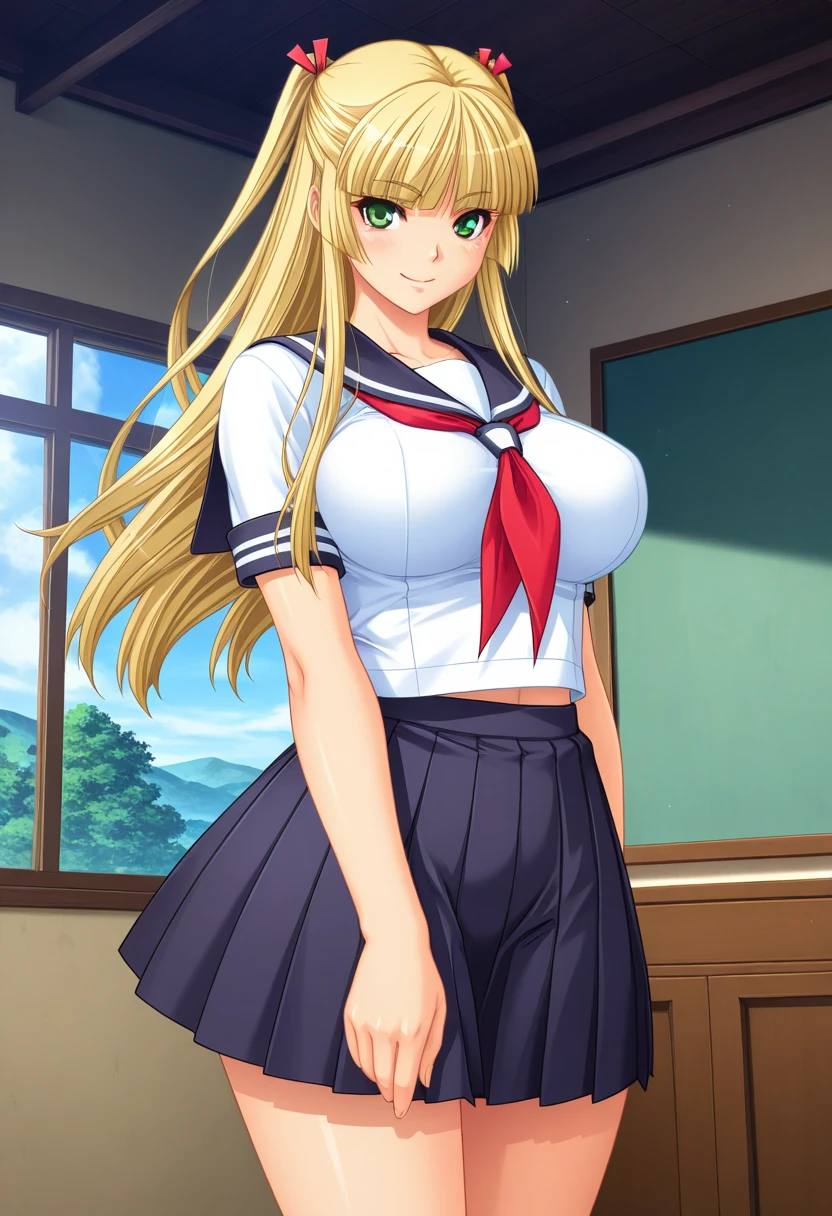 - lulunaww, green eyes, blonde hair, long hair, blunt bangs, two side up, red hair ribbon, large breasts,