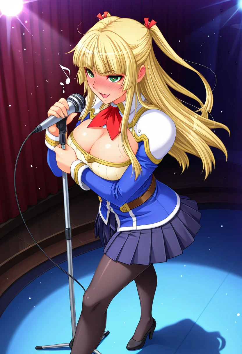 konoe gakuen uniforms, breasts, cleavage, sweater, dark blue pleated skirt, black pantyhose, black high heels,