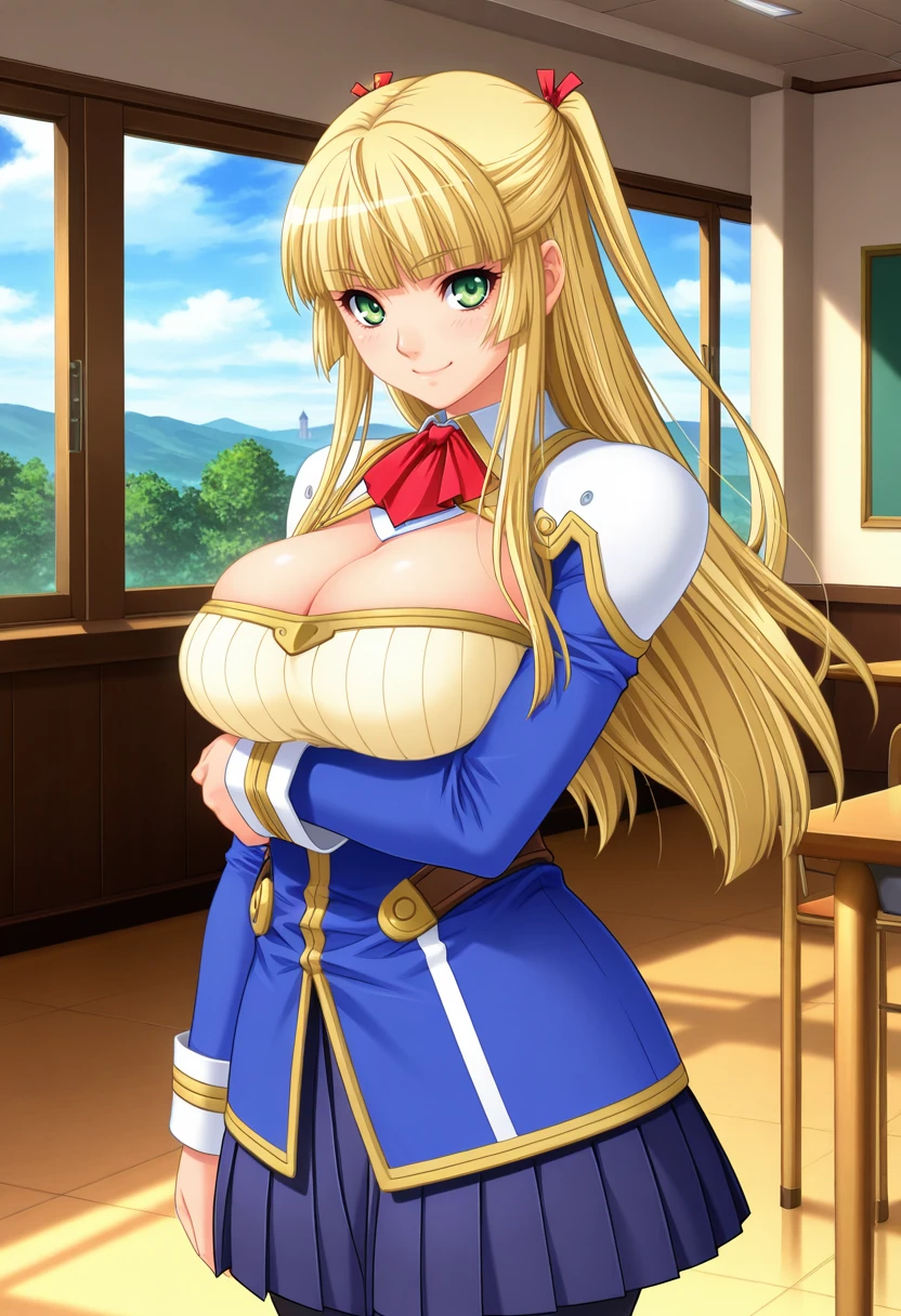 lulunaww, green eyes, blonde hair, long hair, blunt bangs, two side up, red hair ribbon, large breasts,
