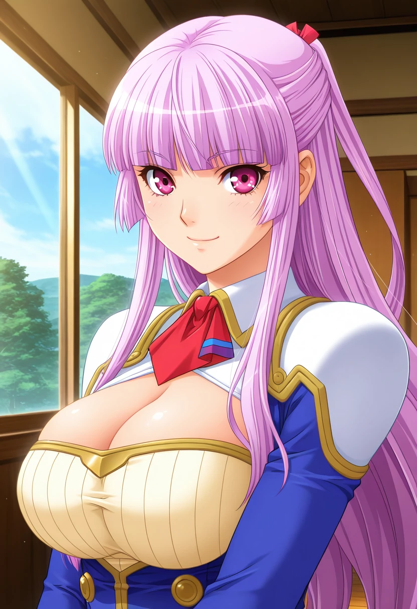 - lunatemisww, pink eyes, light purple hair, long hair, blunt bangs, large breasts,