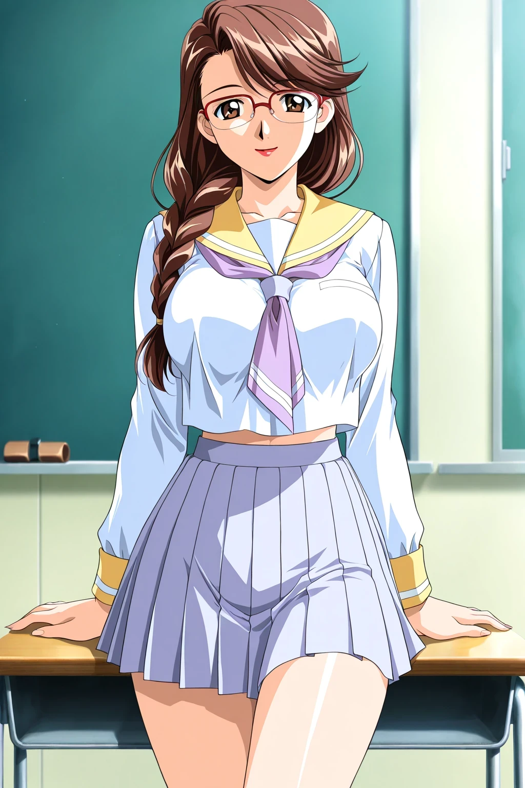 Miyatsuji Kasumi,2000s \(style\),Anime Style,anime coloring, mature female, brown eyes, brown hair, long hair, single braid, swept bangs, mole under mouth, (red lips), red-framed eyewear, large breasts,