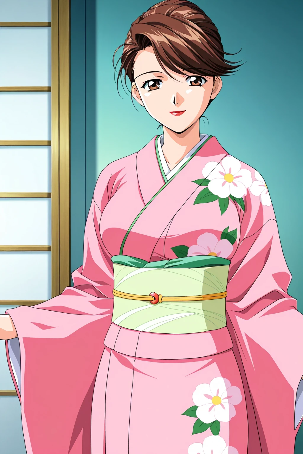 Miyatsuji Kasumi,2000s \(style\),Anime Style,anime coloring, mature female, brown eyes, brown hair,(very short hair), hair up, single hair bun, hair stick, swept bangs, mole under mouth, (red lips), large breasts,