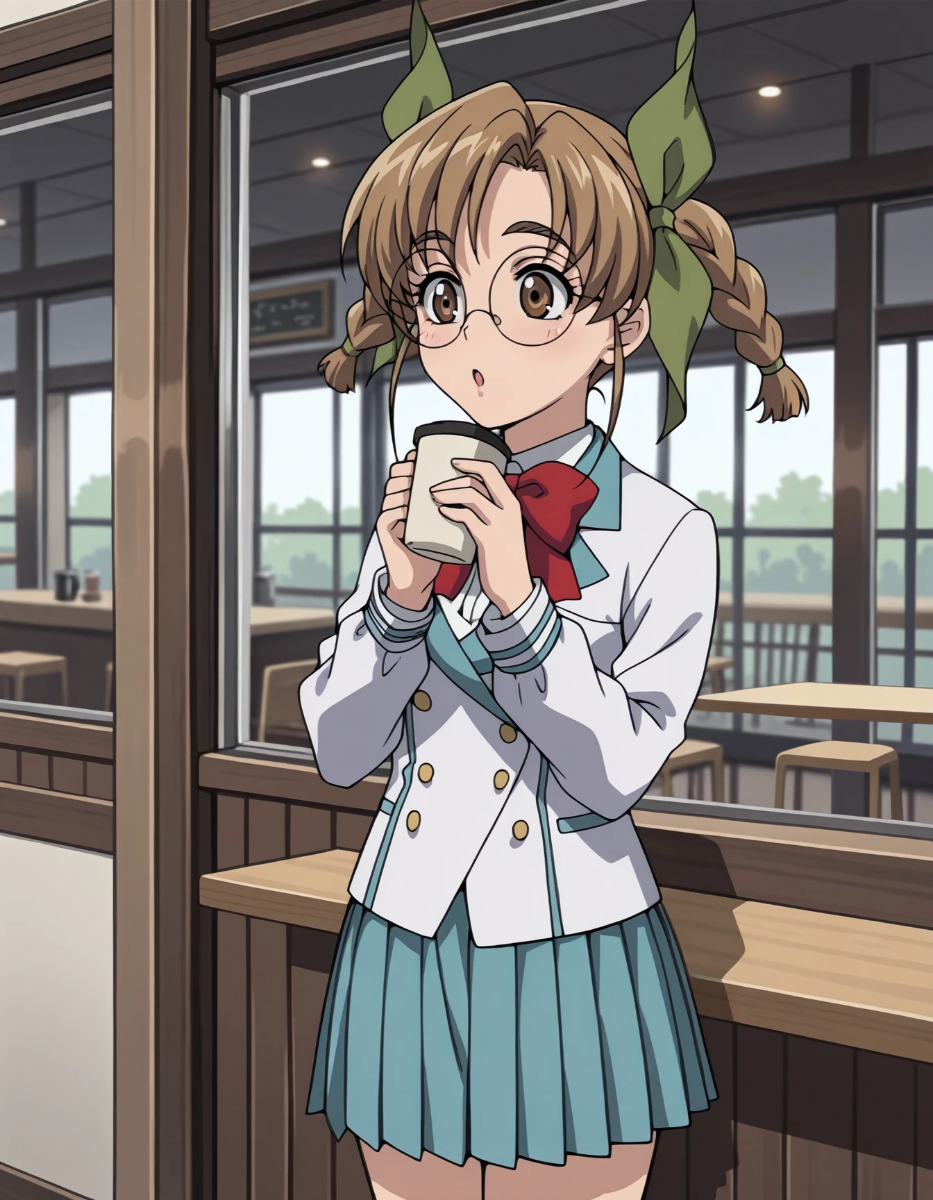 tok1w4ky, round eyewear, hair ribbon, school uniform, pleated skirt
