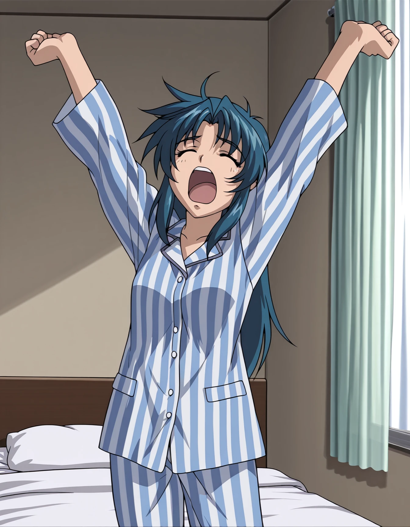 • ch1d0r1, blue hair, hair down, striped pajamas