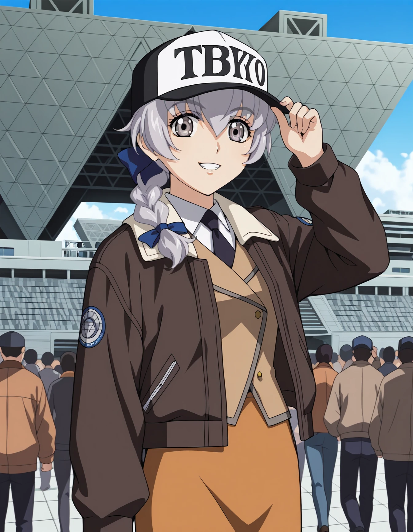 t3leth4t3ss4, baseball cap, braided ponytail, hair bow, brown jacket, orange jacket, necktie, orange skirt