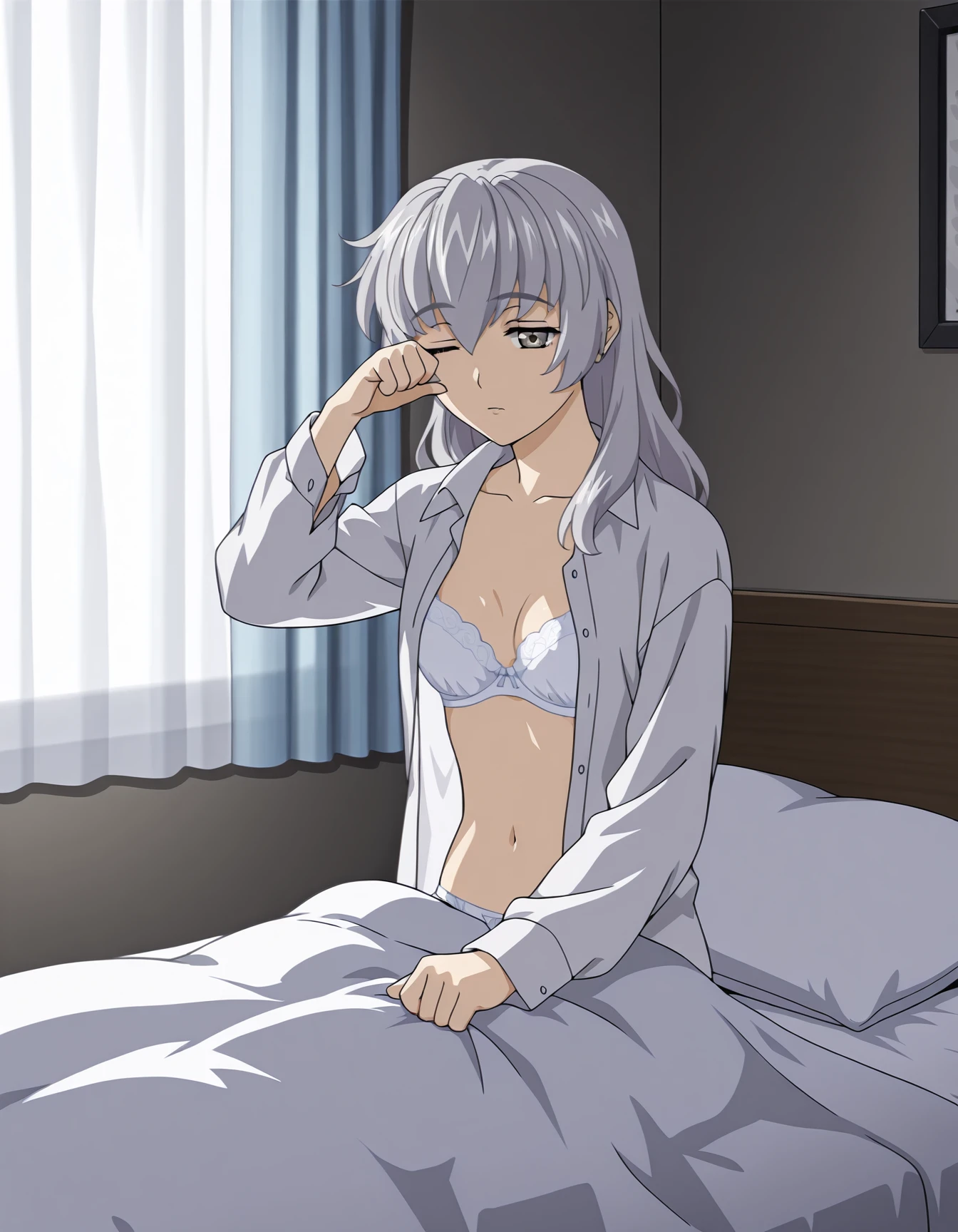 • t3leth4t3ss4, hair down, panties, open clothes, white bra, open shirt, dress shirt