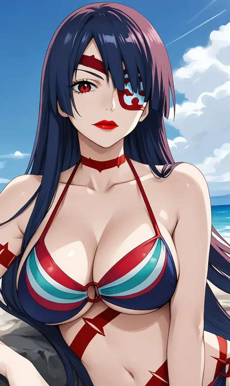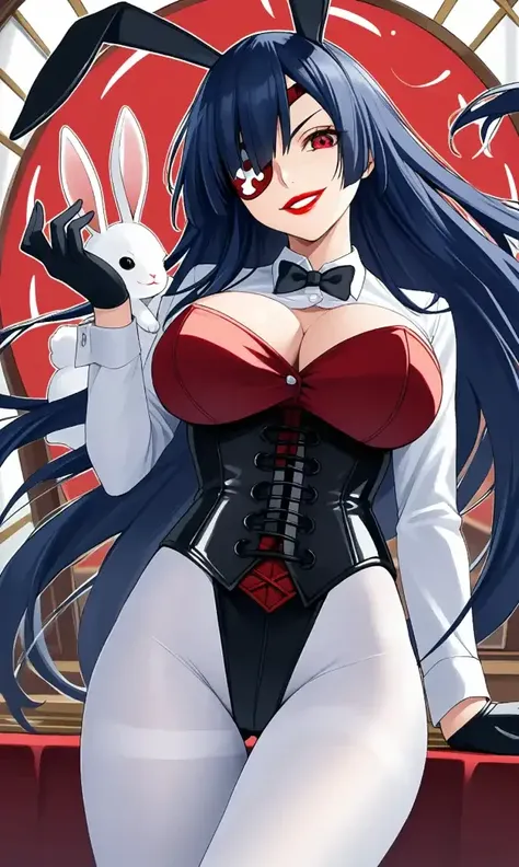 long hair, makeup, eyepatch, lipstick, red lips