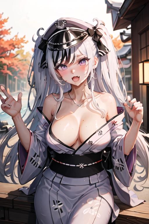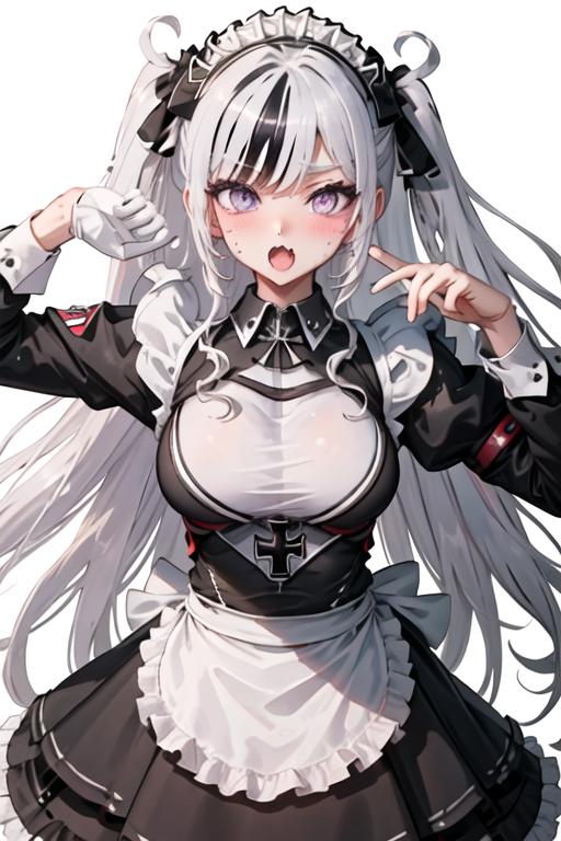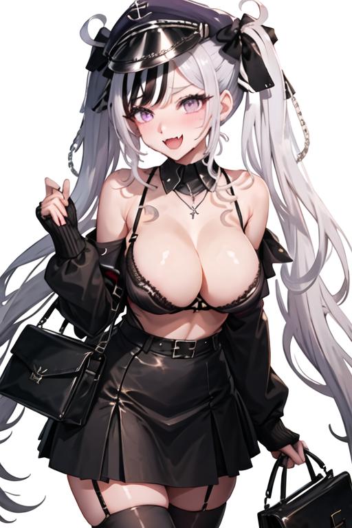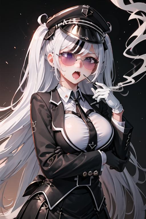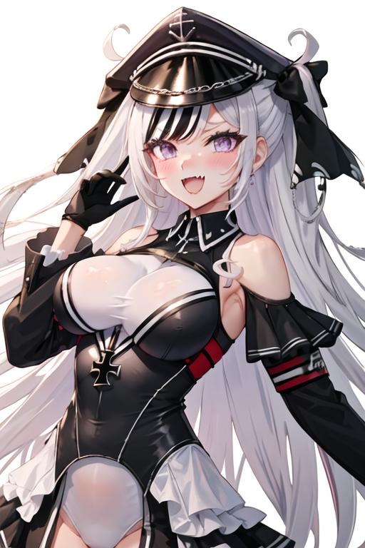 The trigger word is elbe_azurlane, and the recommended tags are best quality, masterpiece, highres, solo, {elbe_azurlane:1.15}, long_hair, purple_eyes, multicolored_hair, breasts, streaked_hair, large_breasts, white_hair, open_mouth, black_hair, fang, skin_fang, cross, blush, iron_cross, hat, black_headwear, peaked_cap, two-tone_hair.
