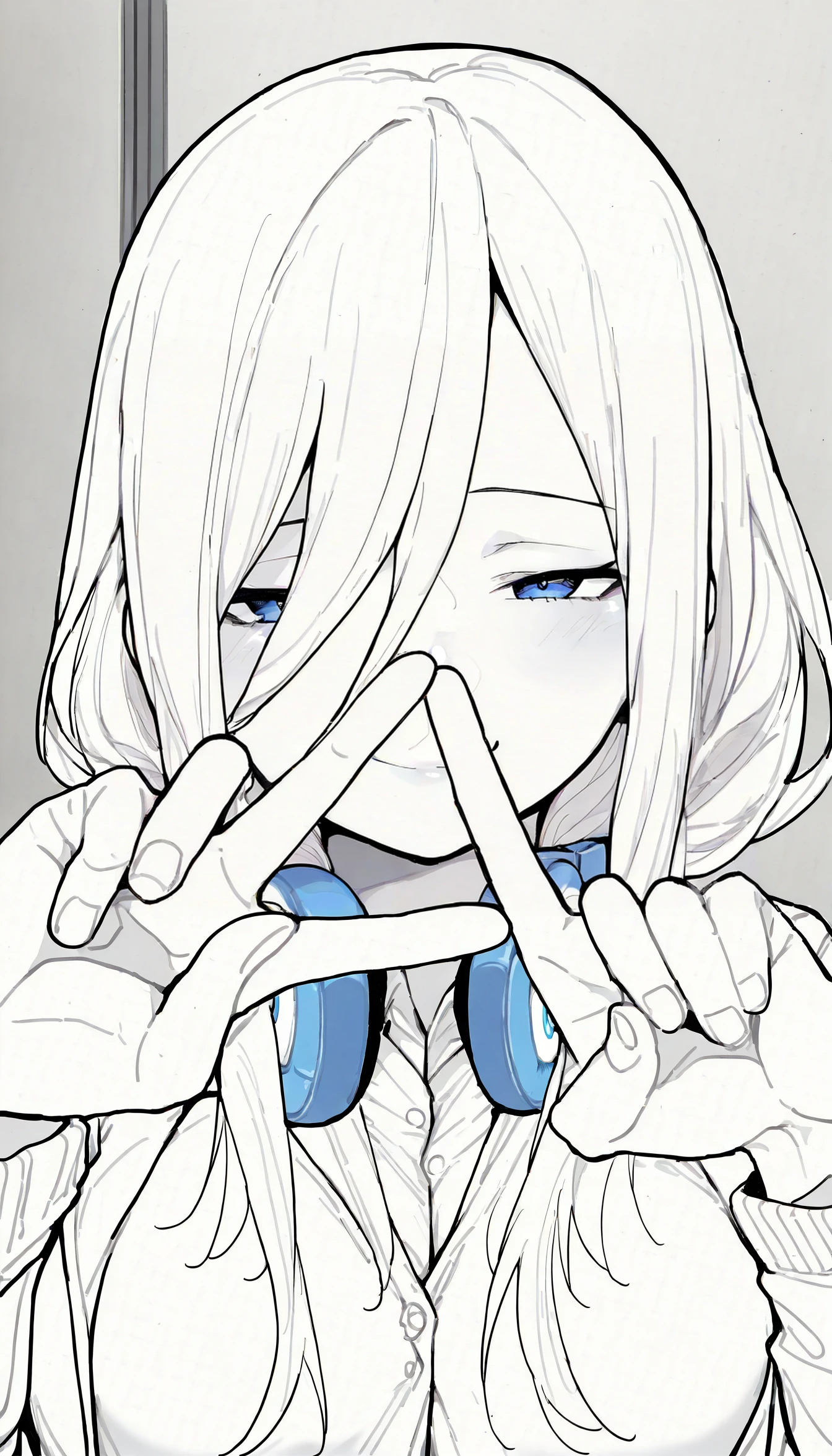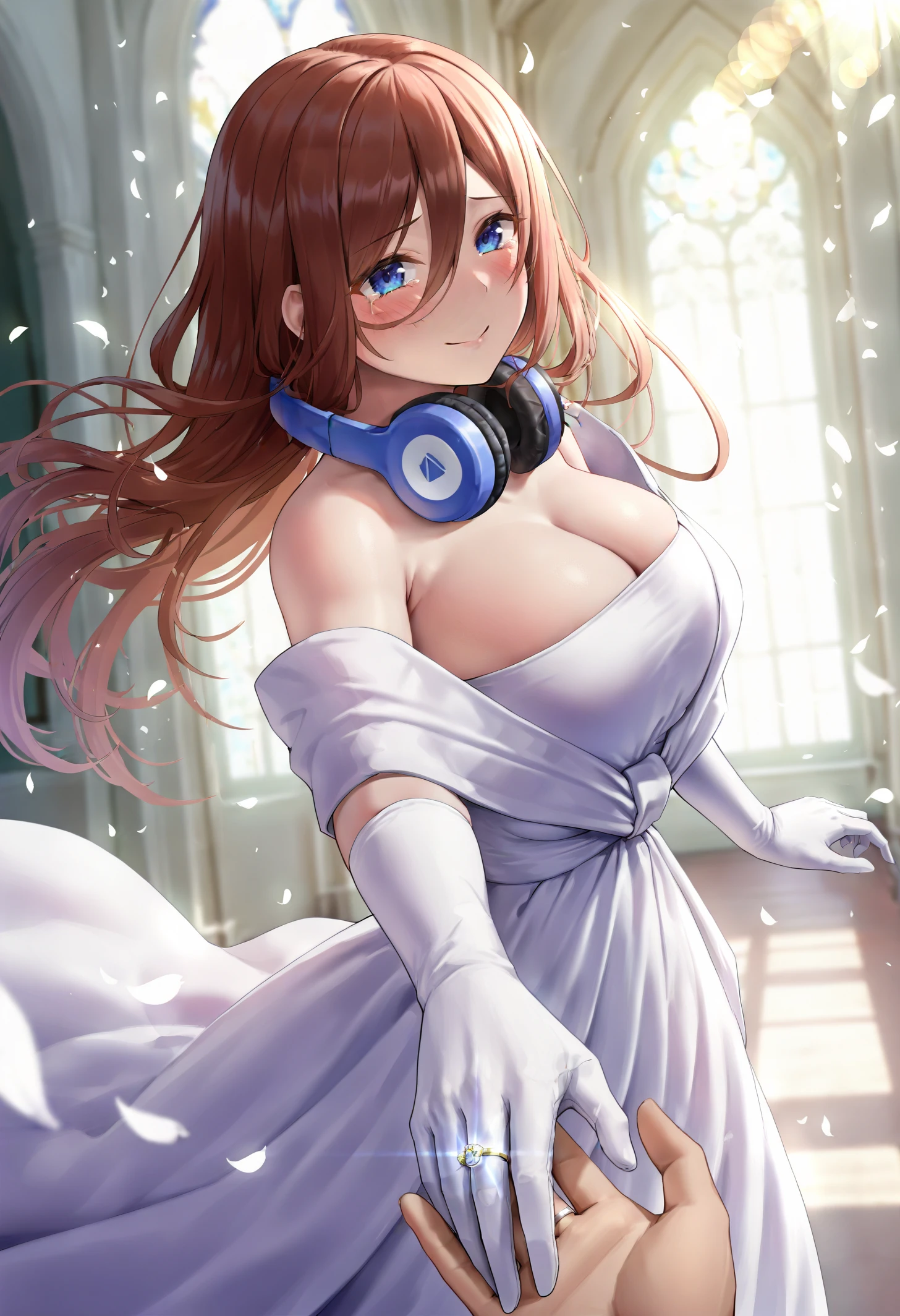 nknmkwdd, blue eyes, long hair, brown hair, hair between eyes, large breasts, headphones around neck, wedding dress, white dress, strapless ??????????-shoulder dress, white gloves, elbow glovesWinter: