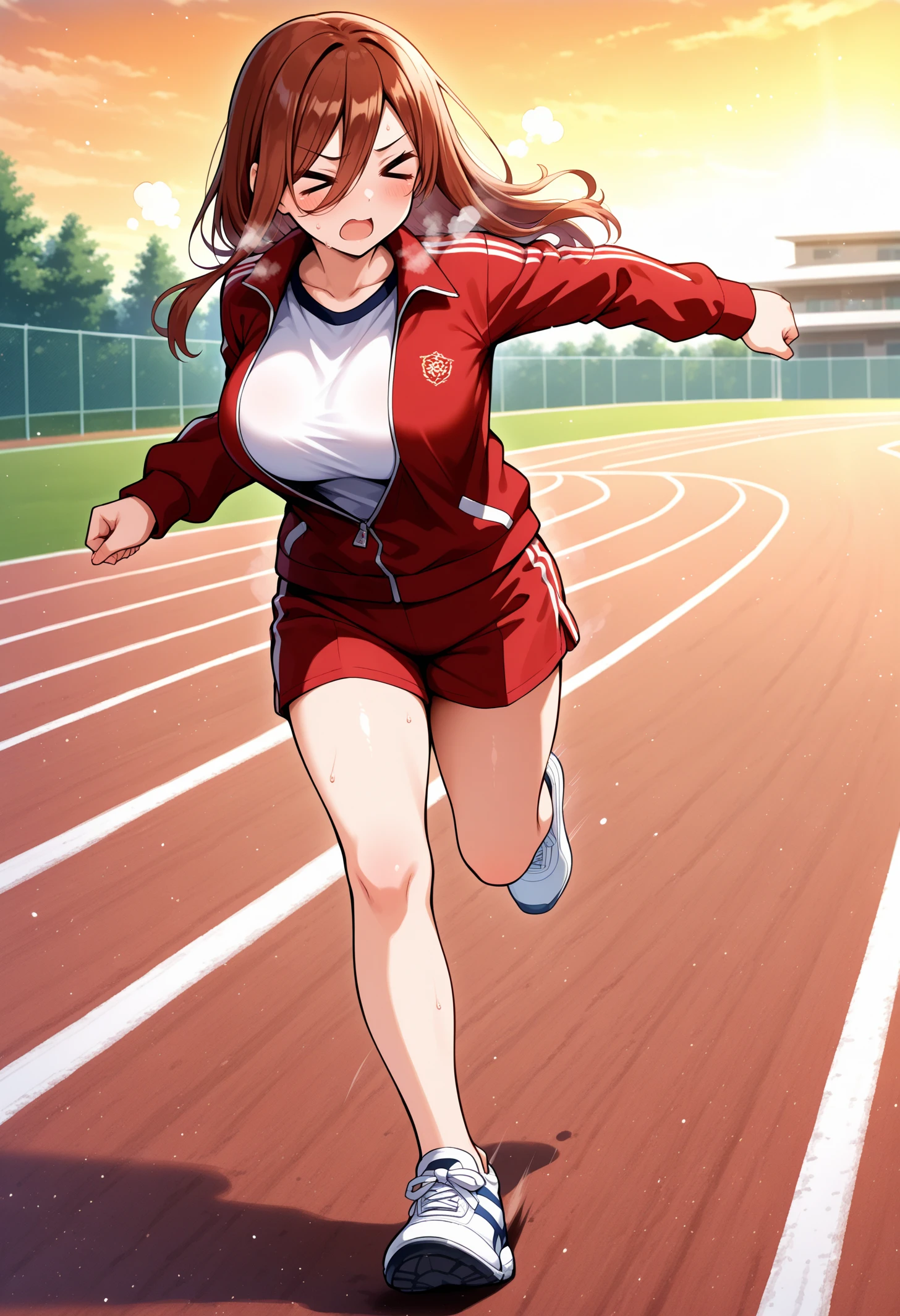 nknmktrck, blue eyes, long hair, brown hair, hair between eyes, large breasts, track jacket, gym uniform, collarbone, white shirt, gym shirt, red jacket, long sleeves, gym shorts, short shorts, red shortsWedding: