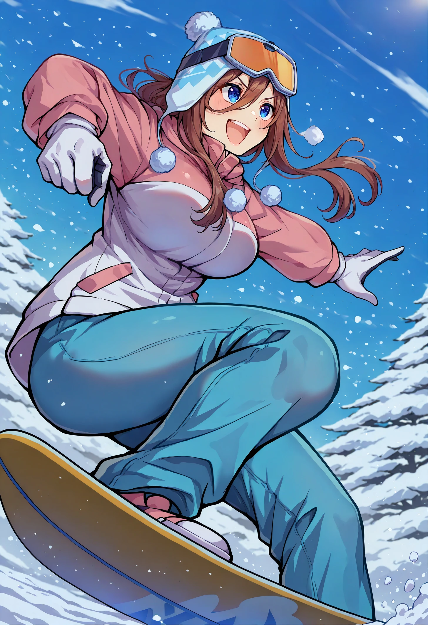 knmkski, blue eyes, long hair, brown hair, hair between eyes, large breasts, ski goggles, hat, beanie, goggles on head, goggles on headwear, pom pom (clothes), winter clothes, winter coat, pink jacket, white jacket, white gloves, long sleeves, white pants