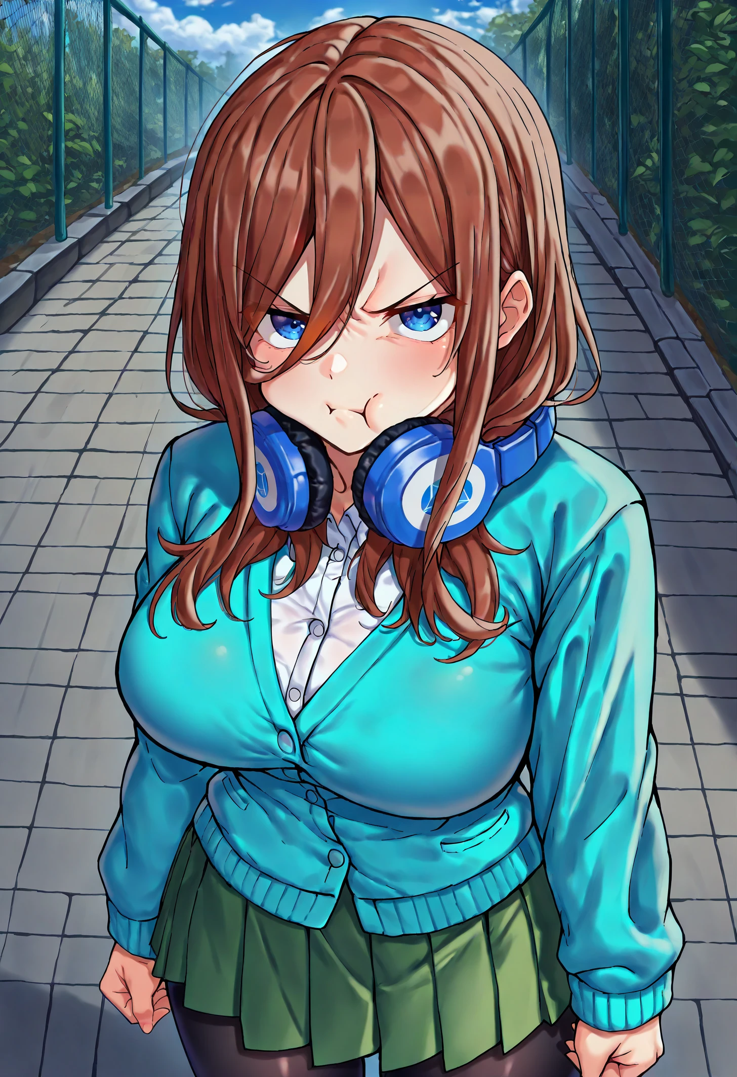 nknmkdef, blue eyes, long hair, brown hair, hair between eyes, large breasts, headphones around neck, school uniform, white shirt, blue cardigan, long sleeves, green skirt, pleated skirt, miniskirt, black pantyhoseBase + jacket: