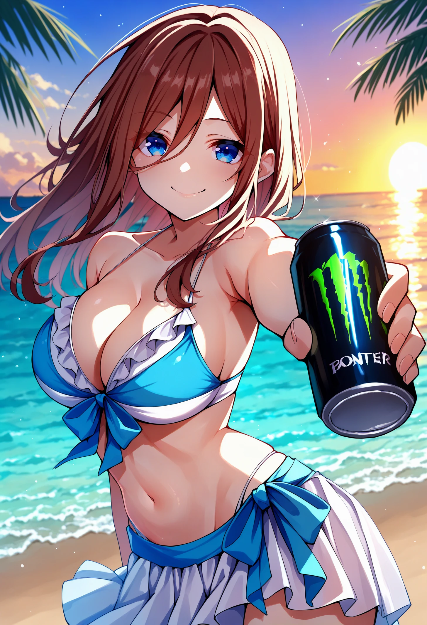nknmkswmst, blue eyes, long hair, brown hair, hair between eyes, large breasts, swimsuit, front-tie bikini top, frilled bikini, two-tone bikini, white bikini, blue bikini, cleavage, bikini skirt