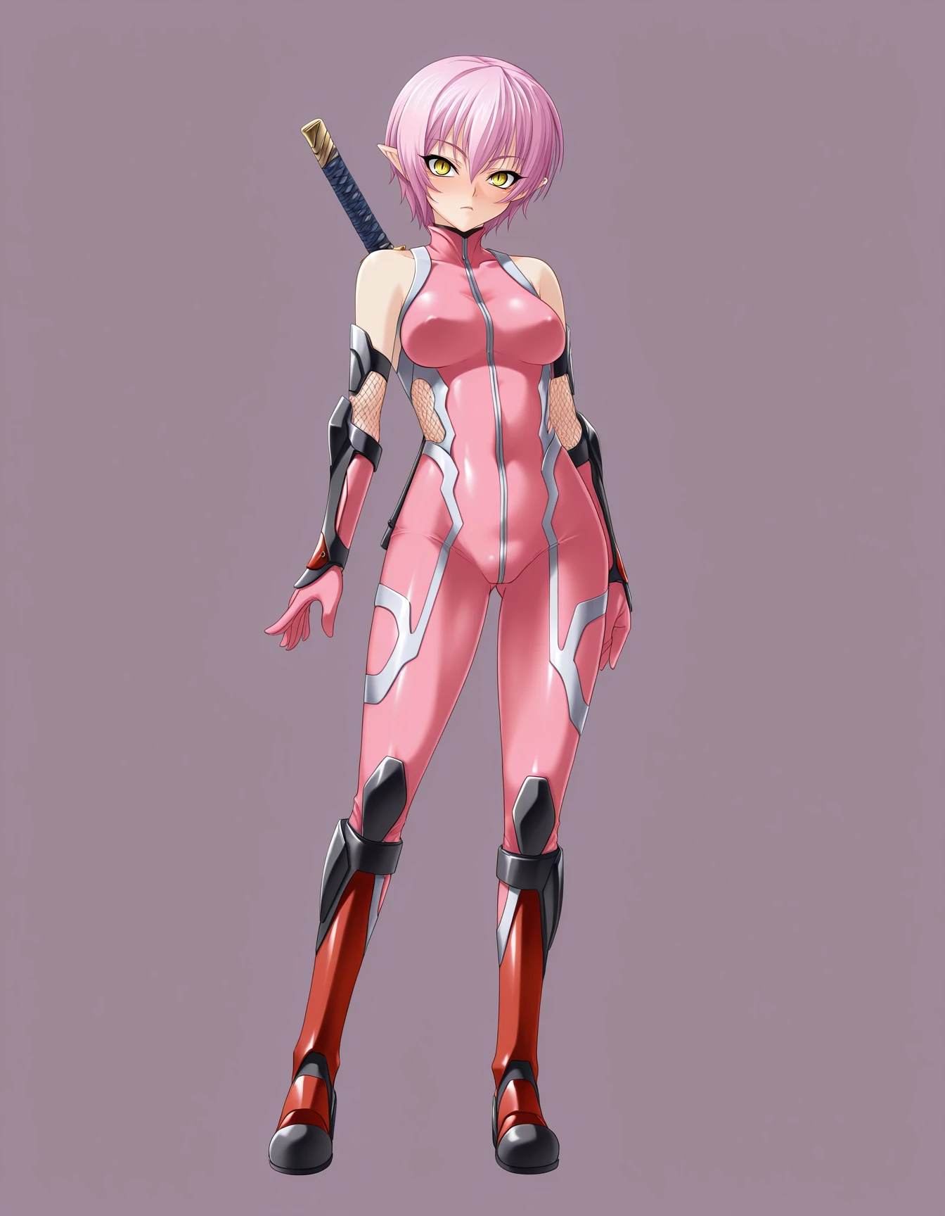 mai_ta2g,mai_oboro_ta2g,short_hair,blunt_bangs,sidelocks,purple_hair,red_lips,large_breasts,highleg_leotard,red_leotard,turtleneck,highleg,high_heel_boots,long_legs,fishnet_pantyhose,center_opening,vambraces,bracer,shoulder_pads