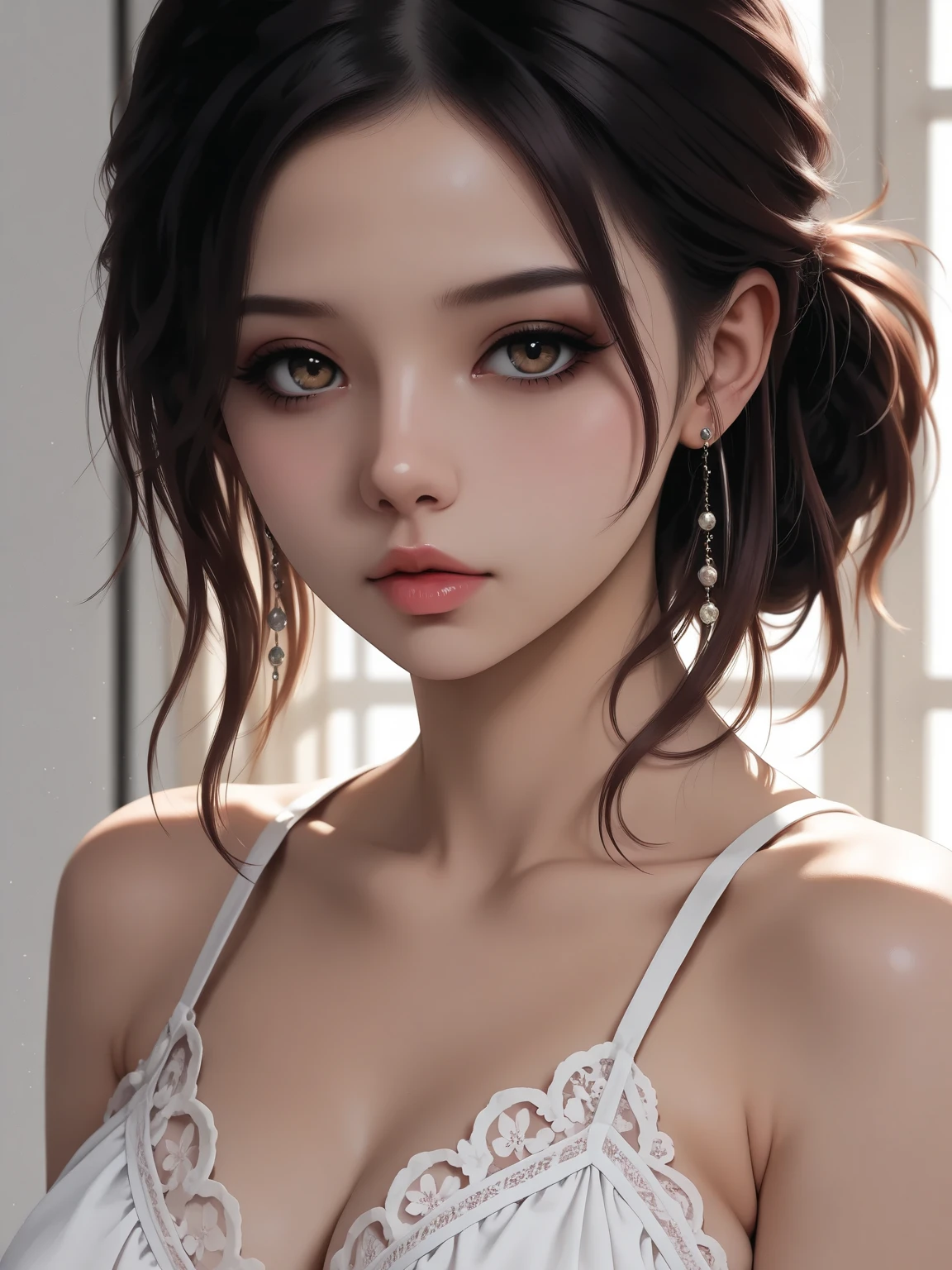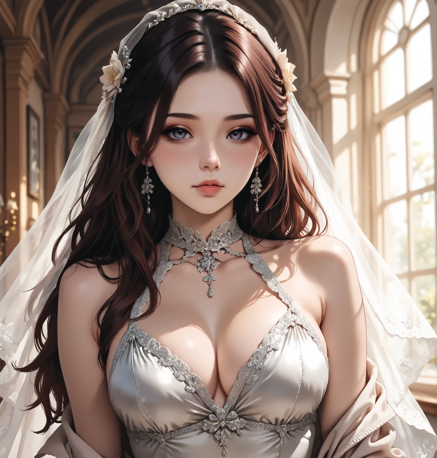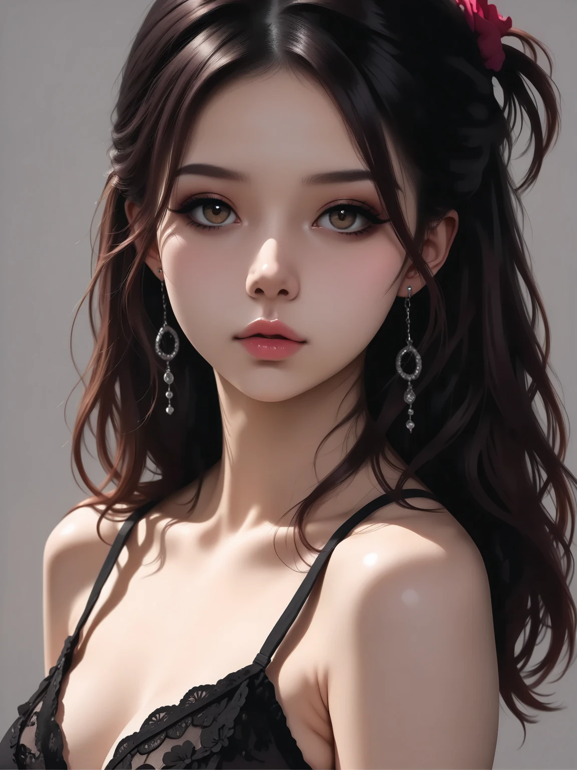 印象的な目つきの女性のクローズアップショットが捉えられています。彼女の黒髪はゆるやかなウェーブがかったスタイルで、背中に流れ落ち、複雑なデザインと真珠が付いた垂れ下がるイヤリングを着けています。彼女のメイクは大胆でドラマチックで、濃い赤のリップが彼女の青白い肌に映えます。彼女の目はスモーキーなアイメイクで強調され、眉は手入れされて埋められています。彼女は首の周りに繊細な真珠のチェーンが付いた黒いチョーカーを着けており、彼女のアンサンブルに優雅さを加えています。照明は柔らかく拡散しており、彼女の顔の輪郭とイヤリングの複雑なディテールを際立たせています。画像のスタイルはファンタジーやゴシック美学を彷彿とさせ、神秘と陰謀の感覚を呼び起こします。