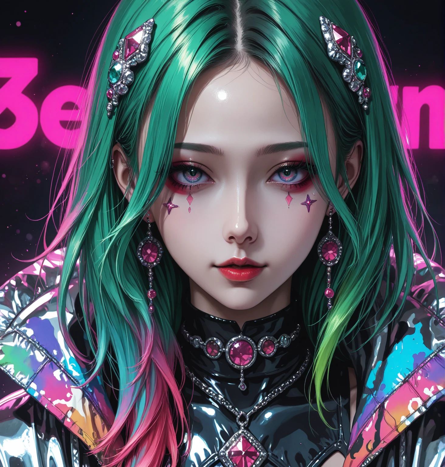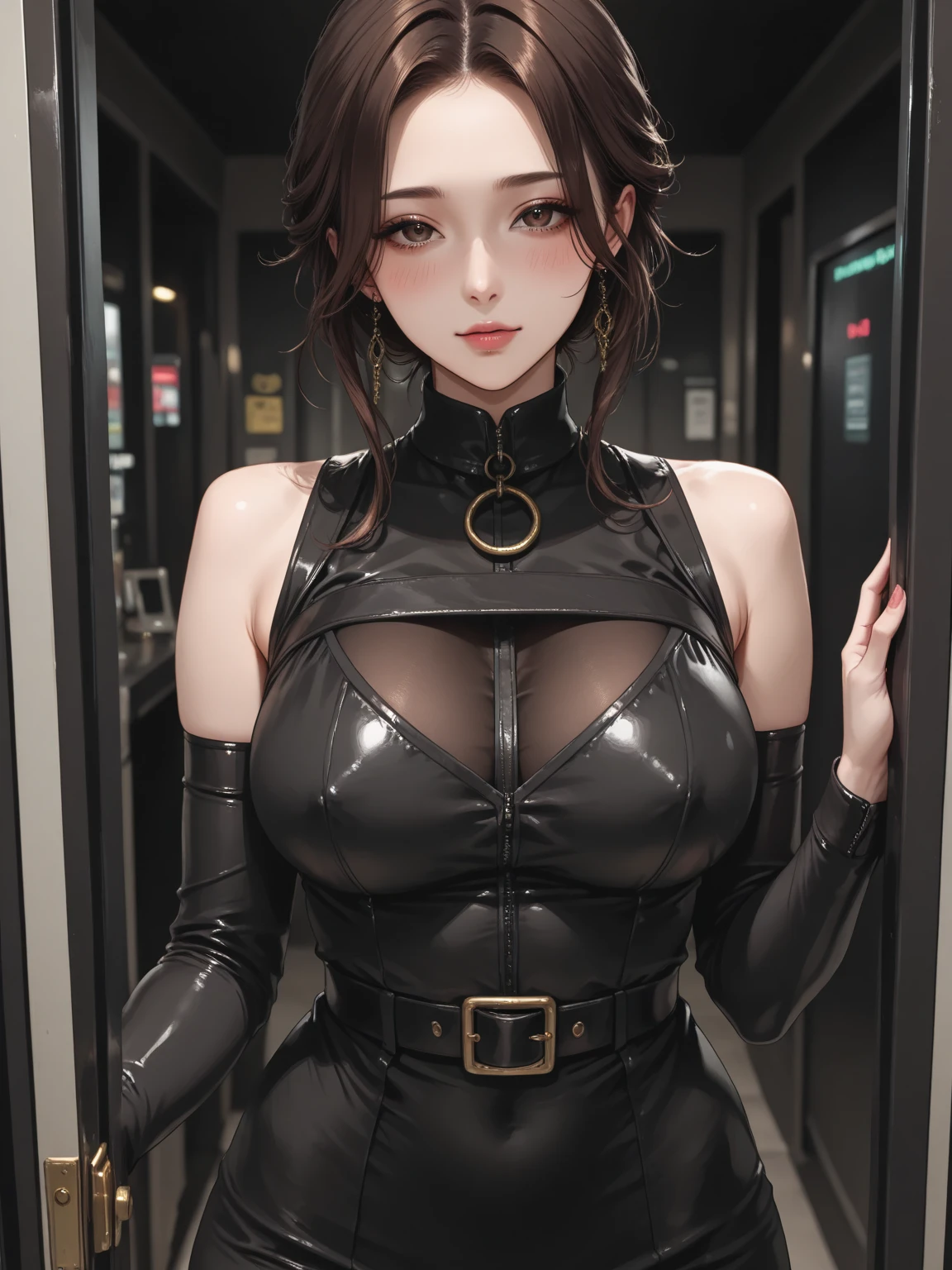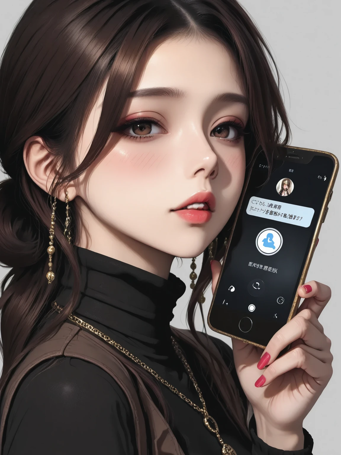 印象的な目つきの女性のクローズアップショットが捉えられています。彼女の黒髪はゆるやかなウェーブがかったスタイルで、背中に流れ落ち、複雑なデザインと真珠が付いた垂れ下がるイヤリングを着けています。彼女のメイクは大胆でドラマチックで、濃い赤のリップが彼女の青白い肌に映えます。彼女の目はスモーキーなアイメイクで強調され、眉は手入れされて埋められています。彼女は首の周りに繊細な真珠のチェーンが付いた黒いチョーカーを着けており、彼女のアンサンブルに優雅さを加えています。照明は柔らかく拡散しており、彼女の顔の輪郭とイヤリングの複雑なディテールを際立たせています。画像のスタイルはファンタジーやゴシック美学を彷彿とさせ、神秘と陰謀の感覚を呼び起こします。
