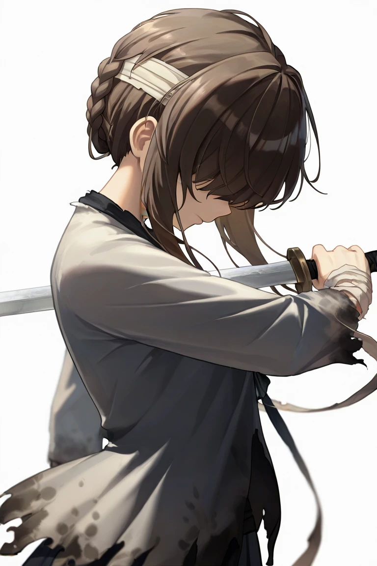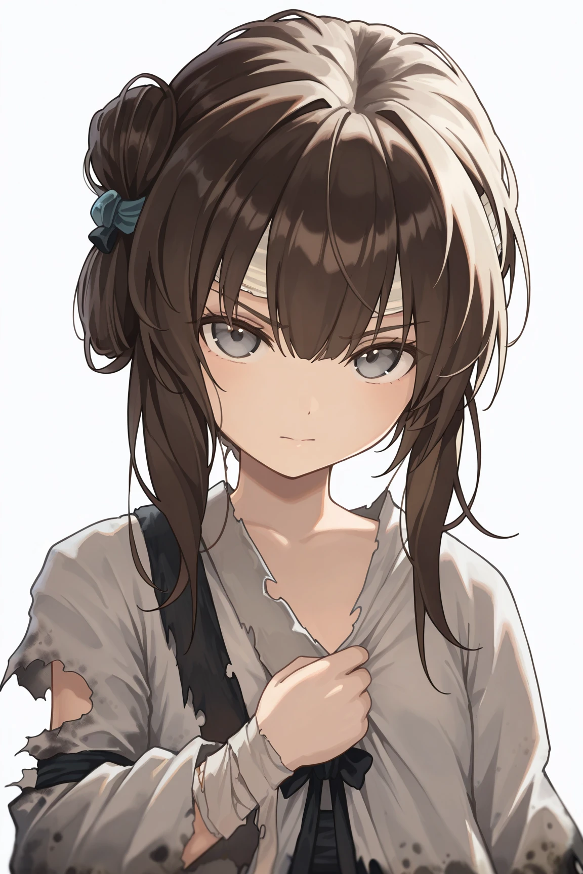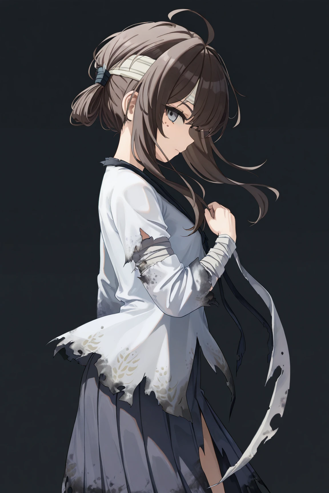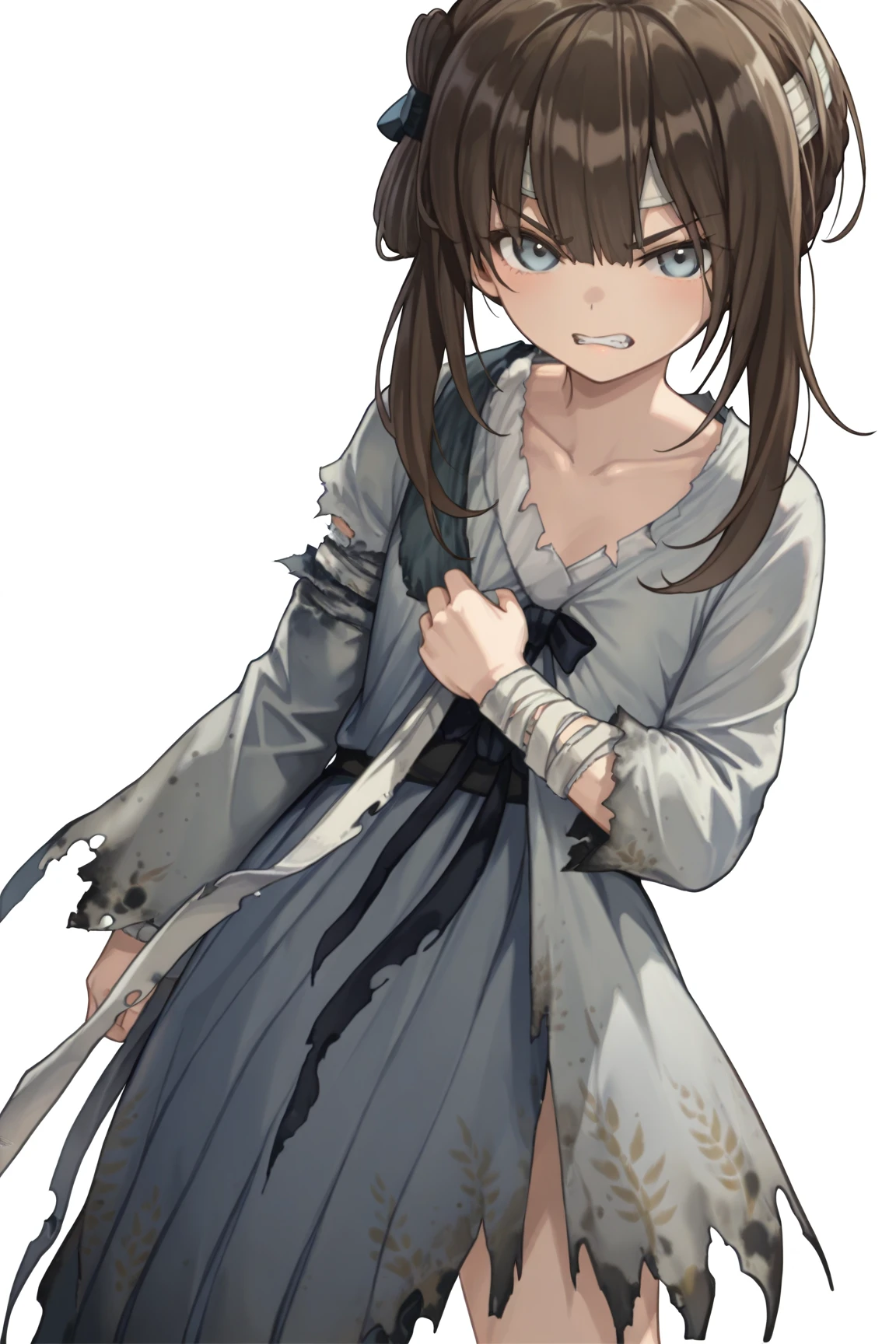 mansui \(epiao\),1girl,bandaged head,solo,bandages,torn clothes,long sleeves,dress,long hair,torn dress,collarbone,