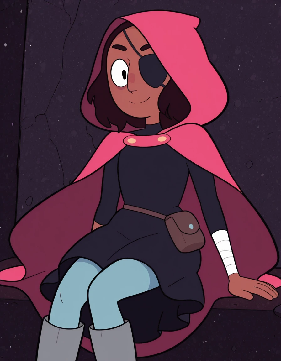 pink cape, hooded cape, black eyepatch, black dress, long sleeves, blue leggings, gray kneeboots, pouch, forearm bandages,