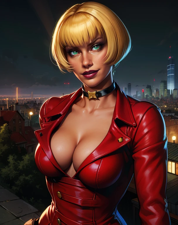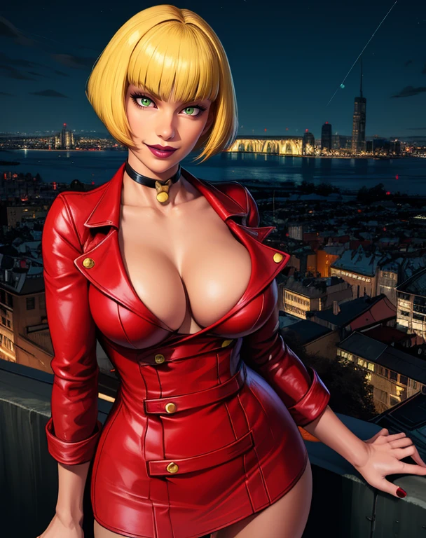 cleavage, choker , short red suit, - black high heels boots, or thigh boots, no bra,