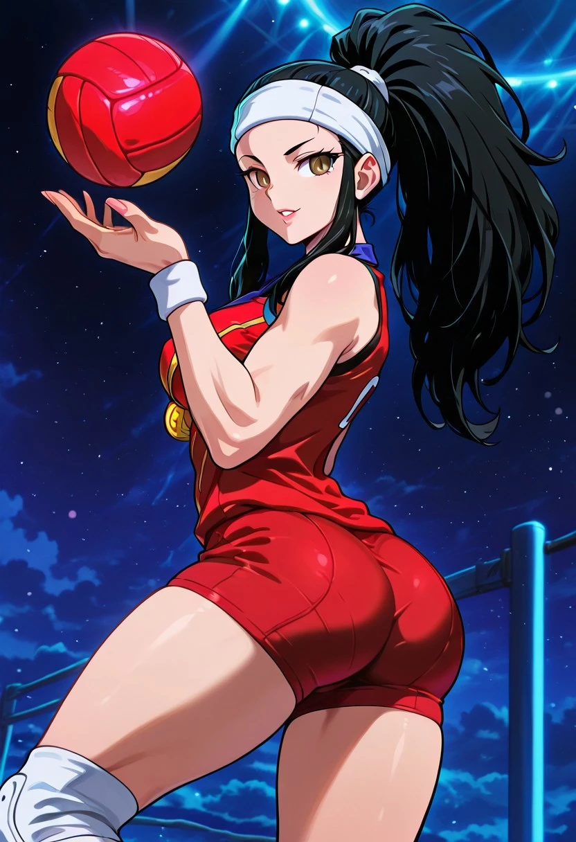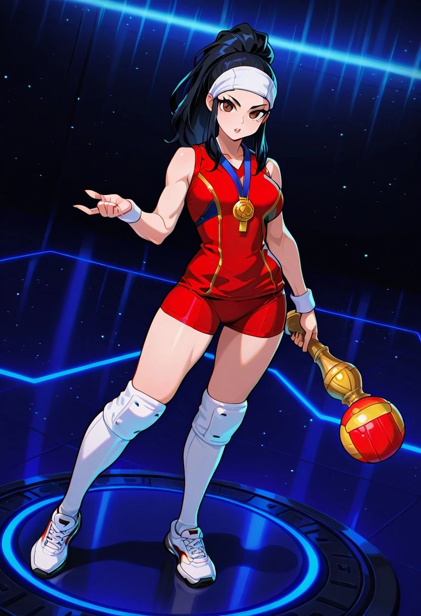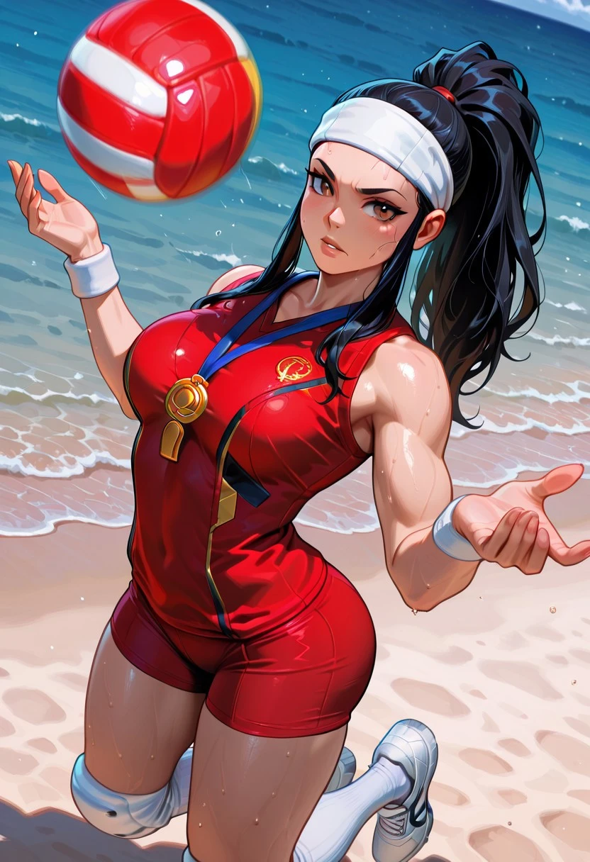 StrikerLiMingHoTS, 1girl, solo, black hair, long hair, ponytail, white headband, brown eyes, full lips, large breasts, thick thighs, large butt, sportswear, red shirt, red shorts, knee pads, white armbands, white gaiters socks, white sneakers, volleyball ball, trophy, golden olympic medal around neck, sleeveless,