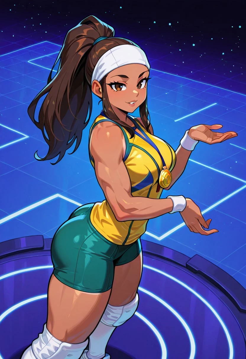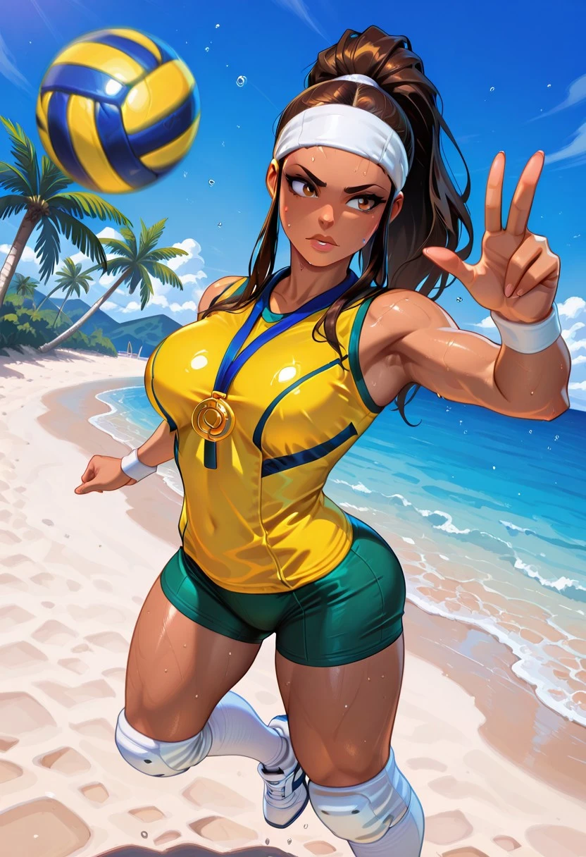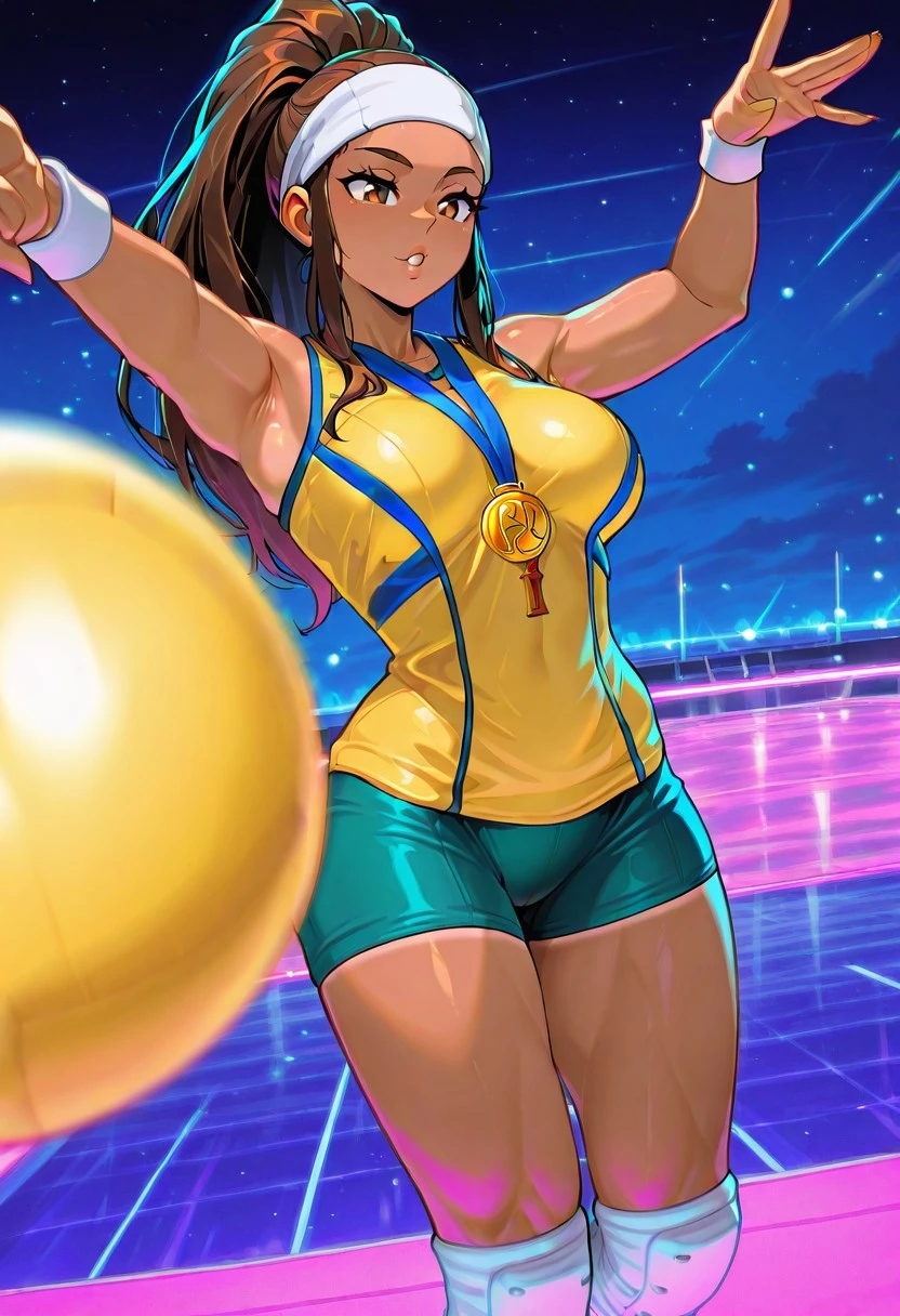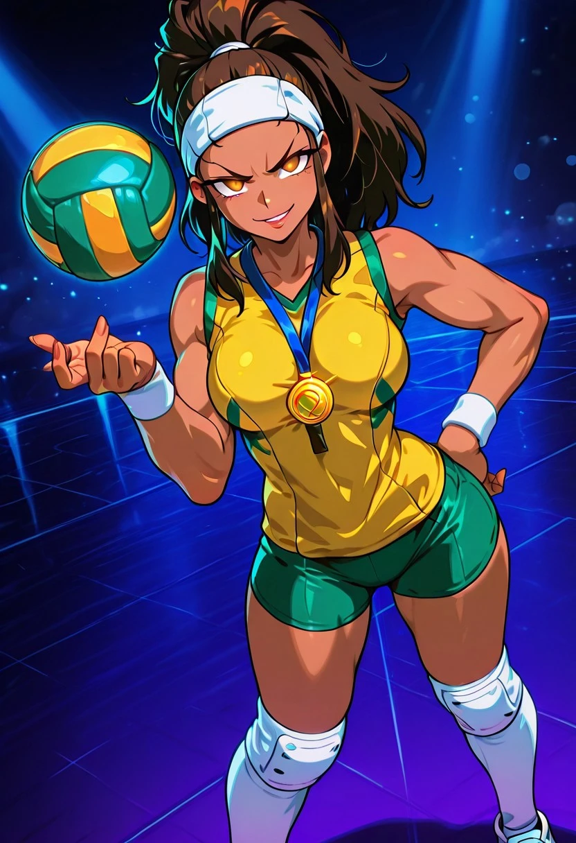 StrikerLiMingHoTS, 1girl, solo, brown hair, tanned skin, long hair, ponytail, white headband, brown eyes, full lips, large breasts, thick thighs, large butt, sportswear, yellow shirt, green shorts, knee pads, white armbands, white gaiters socks, white sneakers, volleyball ball, trophy, golden olympic medal around neck, sleeveless,